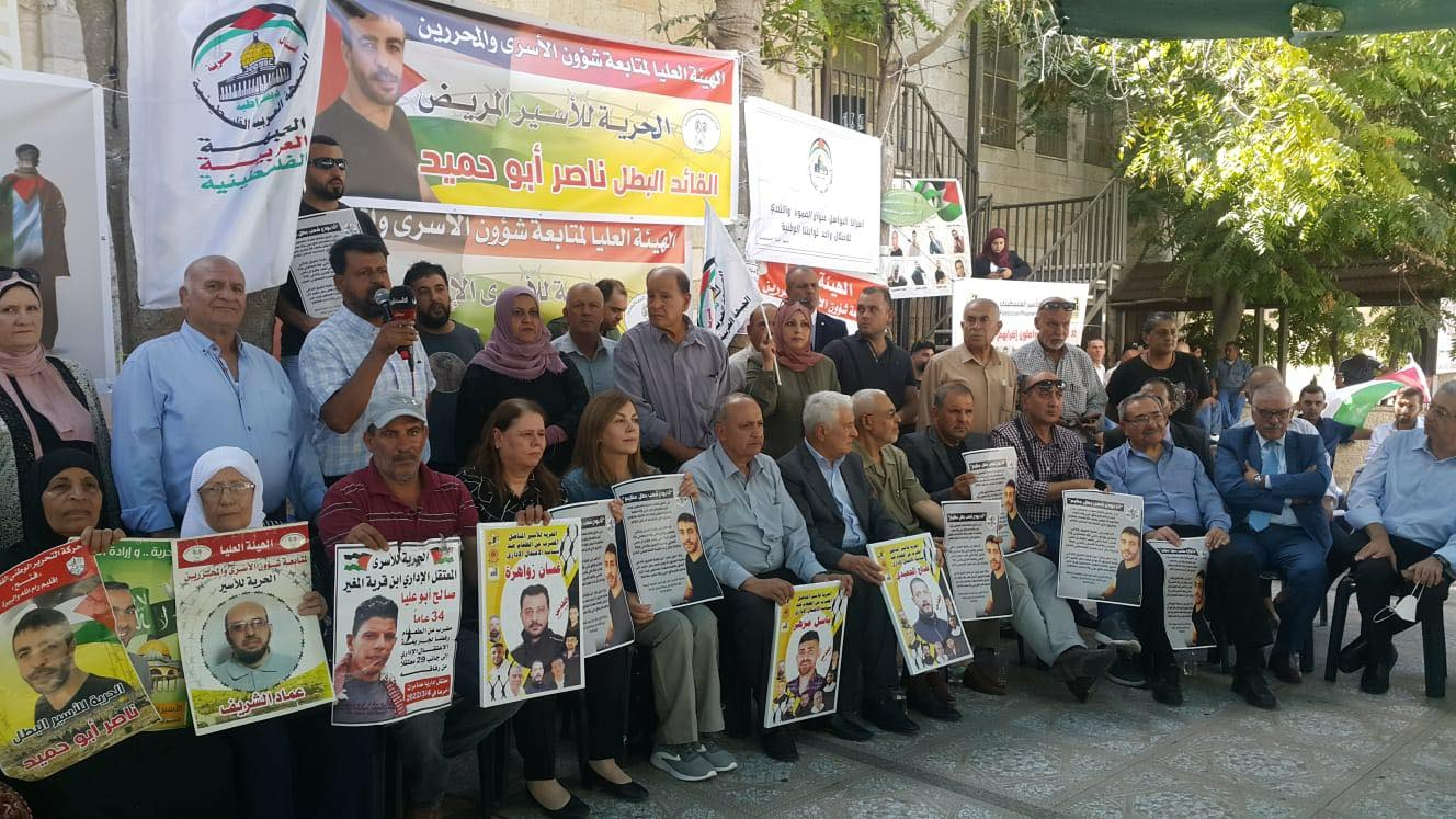 من دعوة اللجنة الوطنية لمساندة الأسرى في سجون الاحتلال، إسنادًا للأسرى منهم المرضى وعلى رأسهم الأسير ناصر ابو حميد، والمعتقلين الإداريين المضربين عن الطعام لليوم الـ10 على التوالي، في خيمة اعتصام دائمة في محافظة رام الله والبيرة وذلك ساحة مركز البيرة الثقافي.