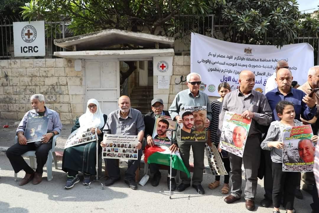 جانب من الوقفة الإسنادية للأسرى في سجون الاحتلال اليوم الثلاثاء من أمام الصليب الأحمر/طولكرم.