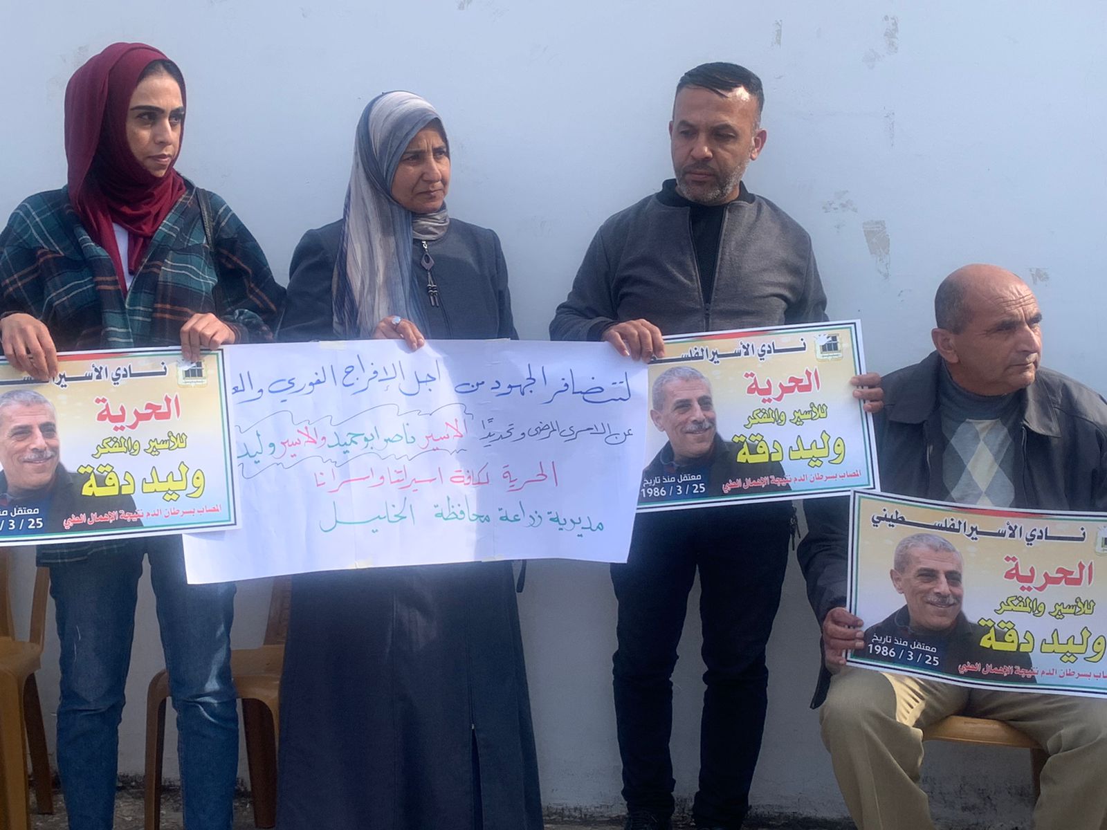 وقفة اسناد مع الأسيرين ناصر ابو حميد ووليد دقة أمام الصليب الأحمر في الخليل