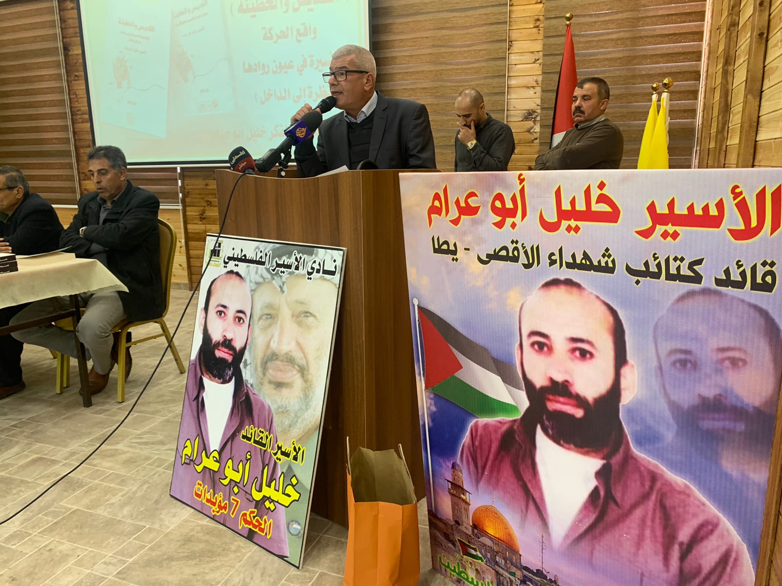وفي كلمة حركة فتح امناء سر الاقاليم القاها عنهم الاخ نبيل ابو قبيطة امين سر حركة فتح في اقليم يطا وضواحيها موجها التحية الى الحركة الوطنية الاسيرة مشيدا بصمودهم خلف القضبان ومستعرضا السيرة النضالية للاسير خليل ابو عرام والذي وهب حياته مناضلا في صفوف حركة فتح وقائدا فعالا فيها مستمرا في دوره النضالي داخل سجون الاحتلال واصفا اياه بقائد الثورة الثقافية داخل السجون ومؤكدا في نفس الوقت ان الحركة الوطنية الاسيرة أصبحت في أحوج ما تكون الى إستعادة دورها النضالي والمؤثر في الساحة السياسية ومطالب الكل الفلسطيني بالتحرك لانقاذ الاسرى من أجرام الاحتلال المستمر بحقهم .