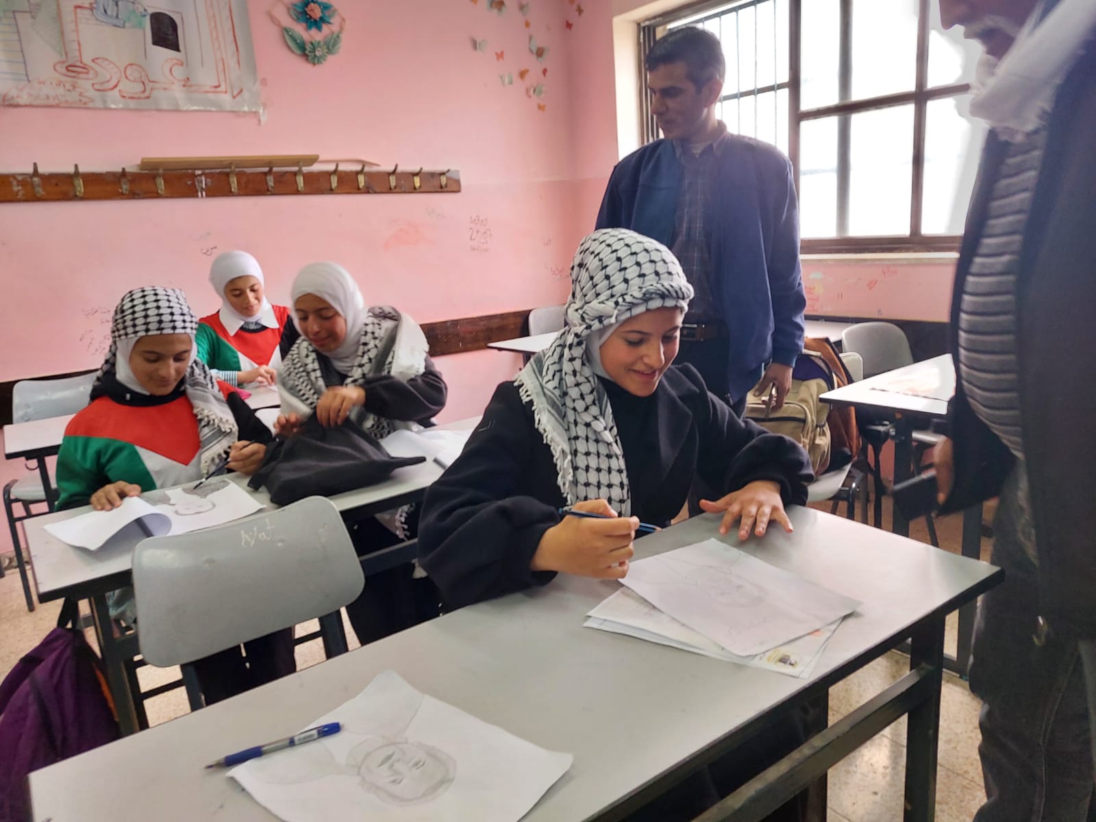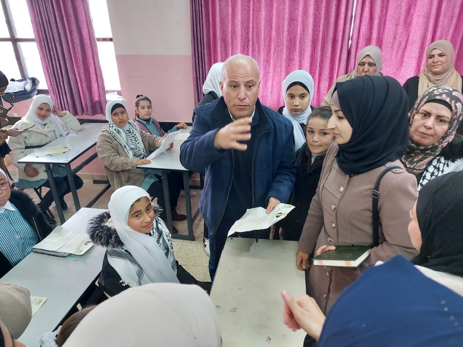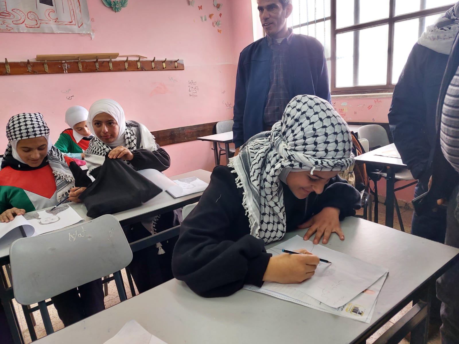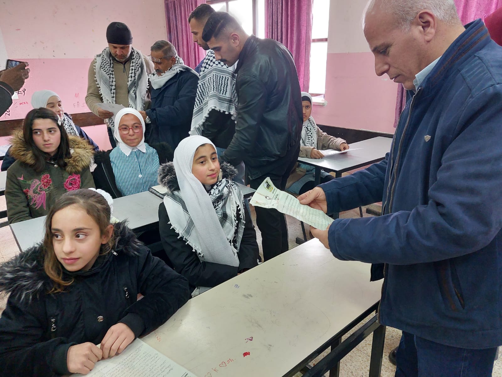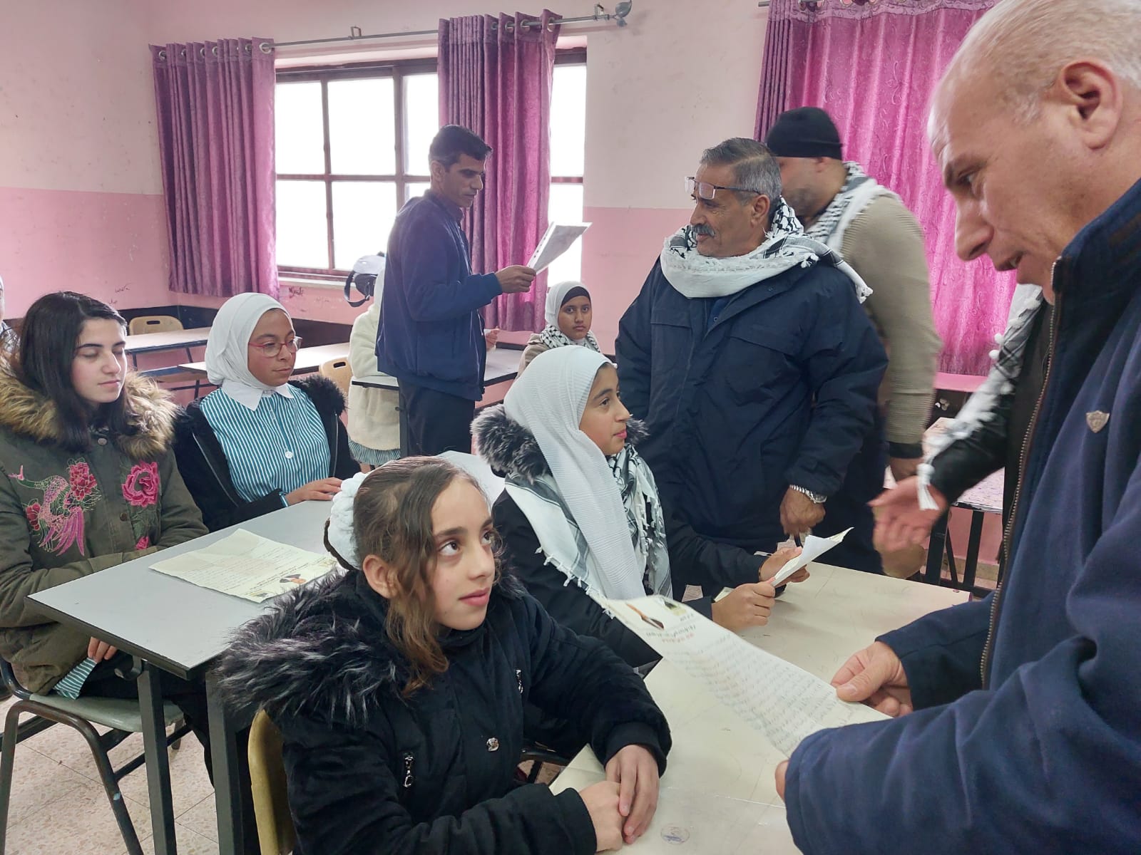 وفي نهاية الحفل الوطني قام منظموا الحفل مع مديرية التربية والتعليم وقيادة اقليم يطا بجولة داخل صفوف المدرسة حيث تقوم الطالبات باعداد الرسوم المعبرة عن نضال الاسير كريم يونس وكتابة برقيات التهنئة لعميد الاسرى كريم يونس حيث عبر الجميع عن تقديرهم الكبير للكلمات والرسومات التي خطتها الطالبات مما يعزز ان كل المحاولات لشطب تاريخ فلسطين من عقول طلابنا بائت بالفشل حيث ان الثقافة الوطنية كانت واضحة في كلمات الطالبات التي كتبت في برقيات التهنئة ...