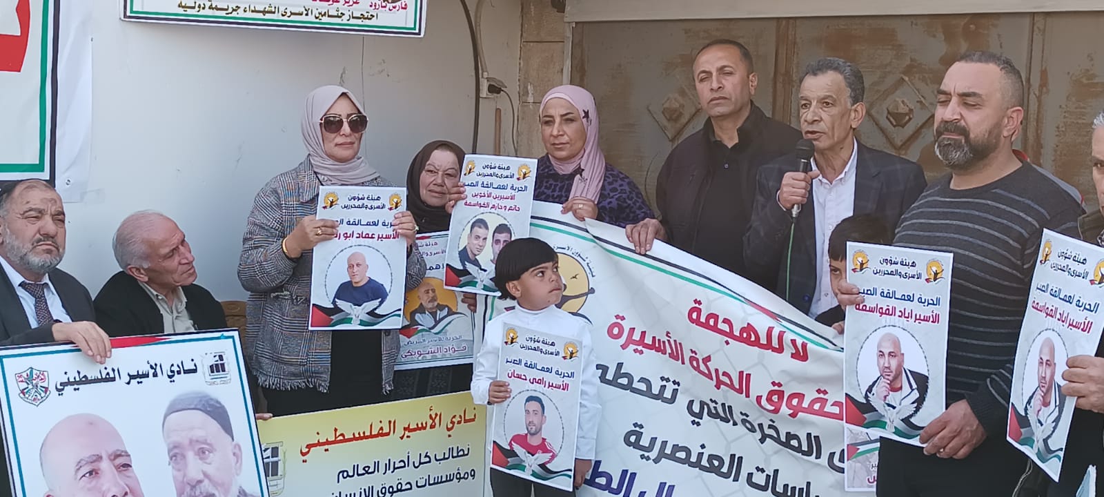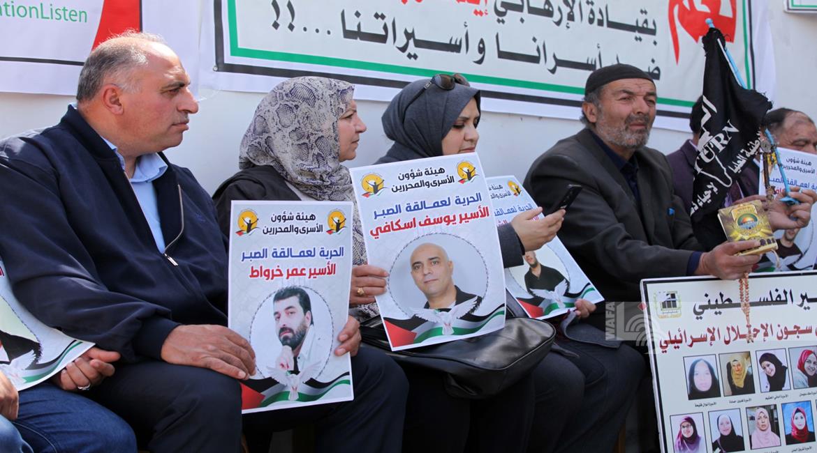 ورفع المشاركون لافتات تجرم اجراءات الاحتلال بحق الأسرى، وأخرى تساند الأسرى في مطالبهم وحقوقهم، وأخرى تطالب المنظمات الحقوقية الدولي بالوقوف إلى جانب الأسرى وتجريم اجراءات الاحتلال.