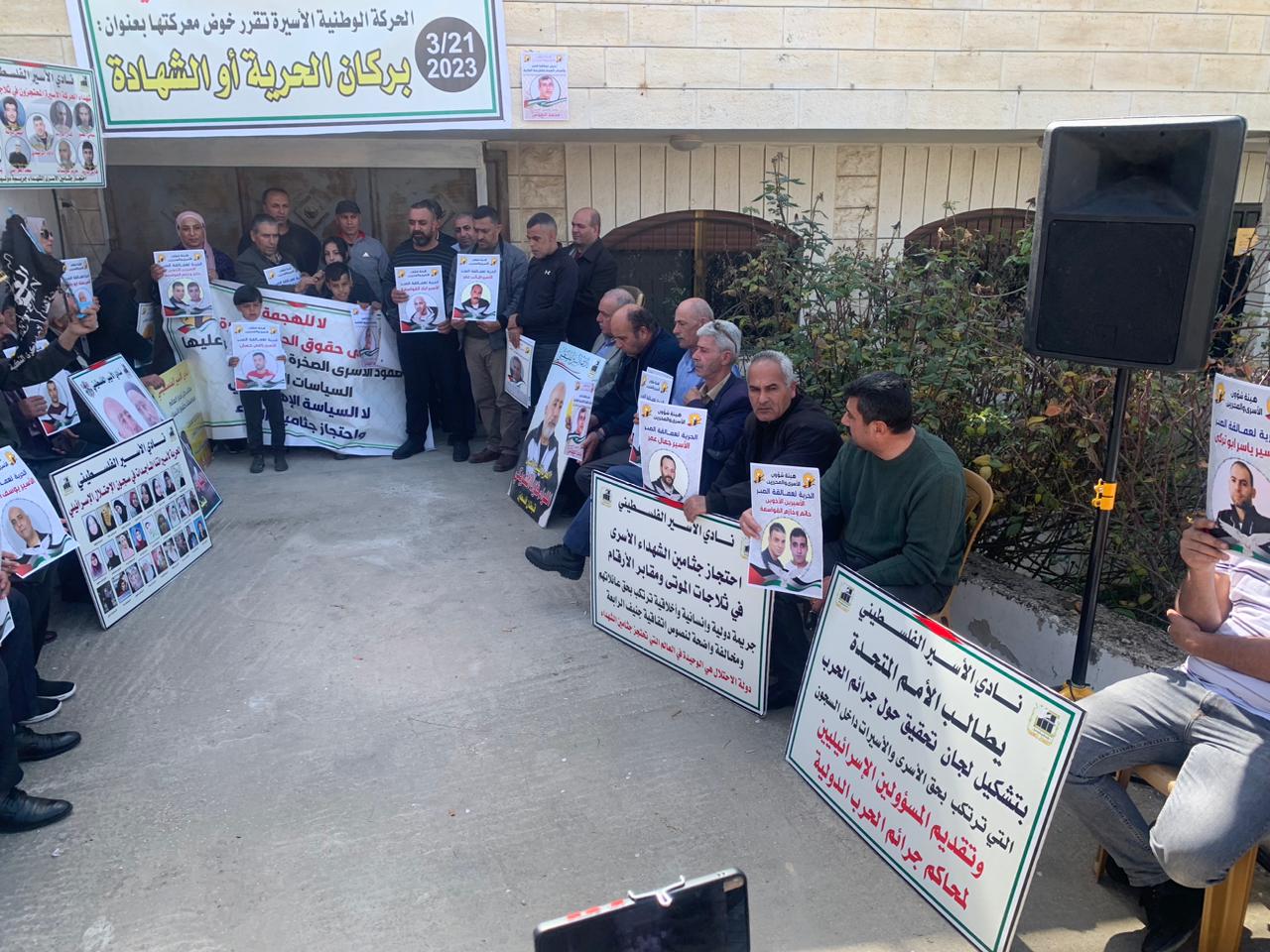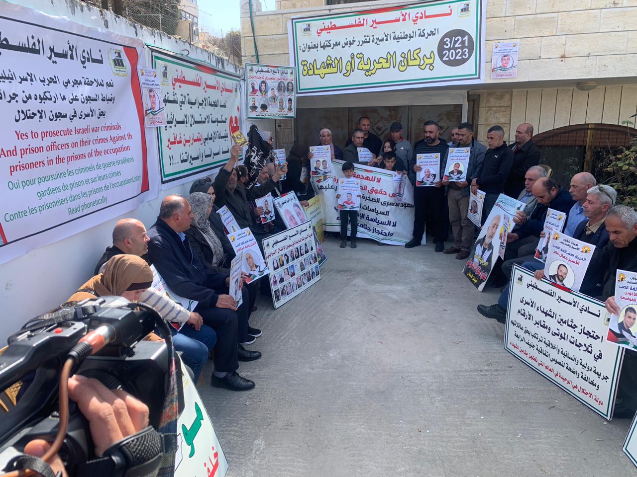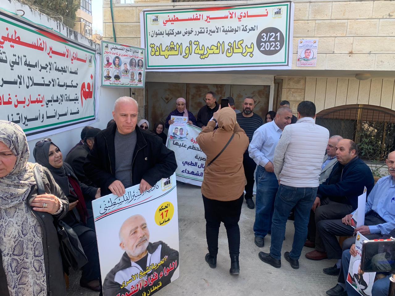 الخليل 2-3-2023 وفا- نظم نادي الأسير الفلسطيني ، اليوم الخميس، وقفة اسناد مع الأسرى، ورفضا لإجراءات الاحتلال ضدهم، بمشاركة هيئة شؤون الاسرى والمحررين، والقوى الوطنية والسياسية في محافظة الخليل، ولجنة أهالي الاسرى، وذلك أمام مقر الصليب الاحمر الدولي بالخليل.