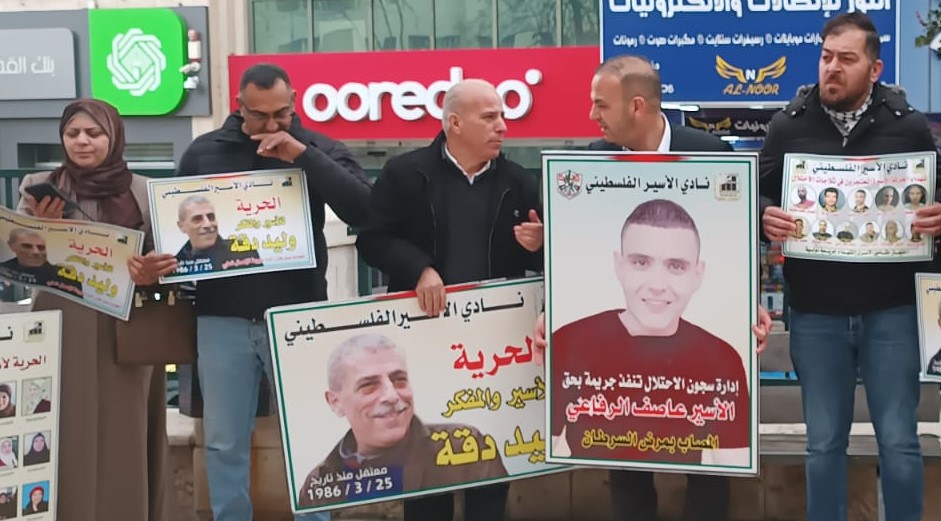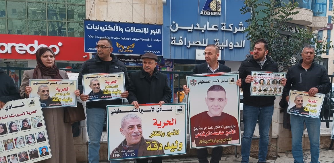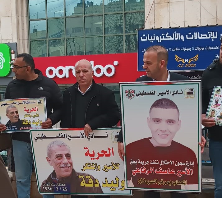 وشارك في الوقفة التي نظمتها فصائل العمل الوطني في المحافظة، بالتعاون مع نادي الأسير الفلسطيني ، وهيئة شؤون الأسرى والمحررين، حشد من المواطنين، وممثلو المؤسسات الرسمية والأهلية، ورفعوا خلالها العلم الفلسطيني، وصورا للأسيرين المريضين وليد دقة وعاصف الرفاعي، ورددوا الشعارات المنددة بالاحتلال والداعية لإنقاذ حياة أسرانا وإطلاق سراحهم.