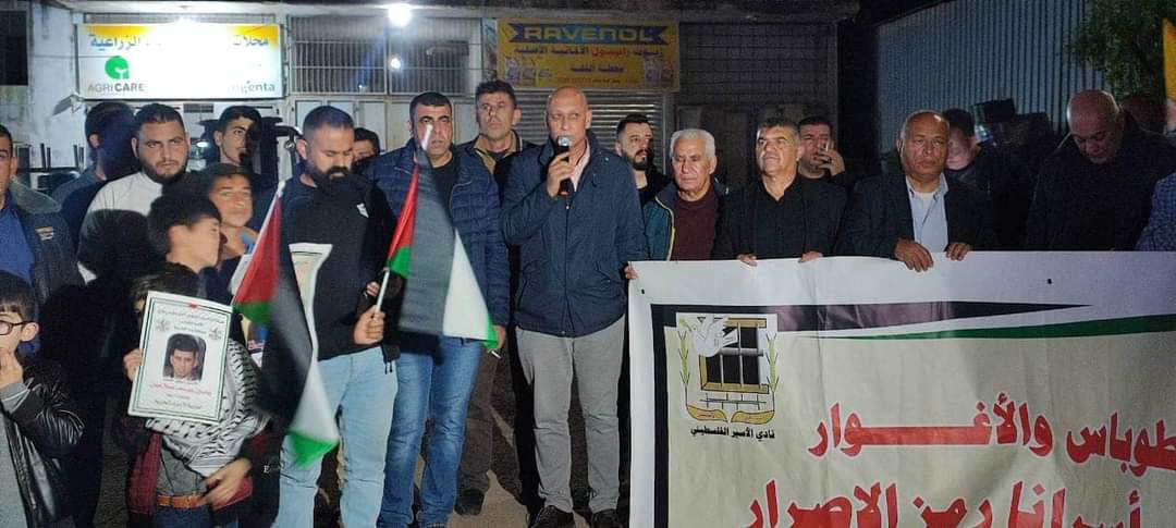 طوباس 4-4-2023 وفا- شارك أبناء شعبنا في محافظة طوباس والأغوار الشمالية، مساء اليوم الثلاثاء، في وقفة دعم وإسناد للأسرى المرضى في معتقلات الاحتلال الإسرائيلي، وذلك في وادي الفارعة جنوب المحافظة.