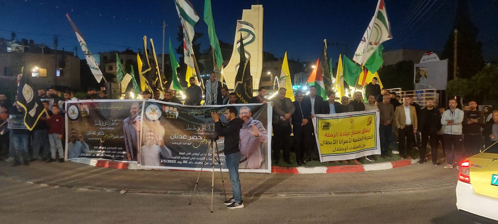 طوباس 2-5-2023 وفا- شاركت جماهير شعبنا في محافظة طوباس والأغوار الشمالية، مساء اليوم الثلاثاء، في وقفة تنديدا باغتيال الشهيد الأسير خضر عدنان.
