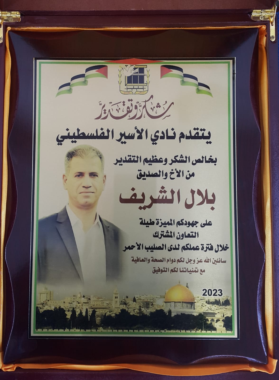 محافظـة الخليـل ومـؤسساتها تقيم حفل تكريم للأخ بـلال الشــريف مســـؤول الاعــلام فــي الصليب الأحمر الدولي في جنوب الضفة