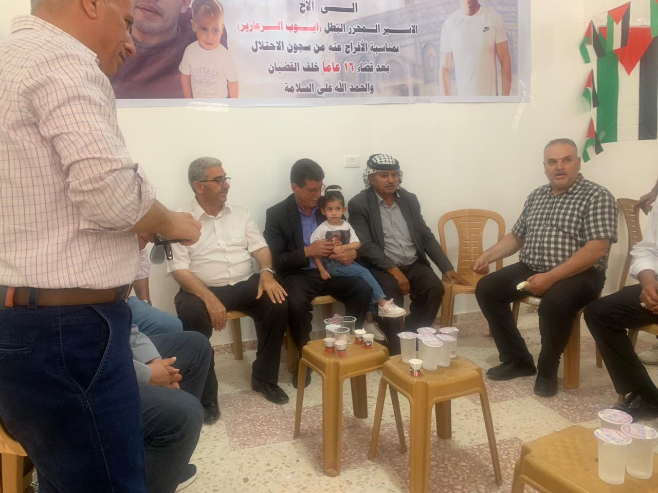الخليل / وفاء وتقديرا وتكريما لمن أمضوا زهرة شبابهم خلف القضبان قدم وفد كبير من نادي الأسير الفلسطيني وعلى رأسه الأخ قدورة فارس رئيس نادي الأسير وكادر من الاسرى المحررين الذين امضوا سنوات طويله في سجون الاحتلال ووفد من هيئة التوجيه السياسي الوطني ممثلا بالاخ العميد إسماعيل غنام المفوض السياسي لمحافظة الخليل ولجنة التثقيف الوطني ممثلا بالاخوة الكادر موسى أبو صبحة وأبو حسن جبارين والعميد عزيز عيايدة ومنقذ أبو عطوان مدير هيئة شؤون الاسرى والمحررين مديرية شمال الخليل التهاني والتبريكات لثلاثة أسرى من أبناء محافظة الخليل والذين تحرروا من سجون الاحتلال وهم الأسير رامي حسان والذي امضى 19 عاما في سجون الاحتلال وايوب الزعارير وعامر أبو رموز والذين امضيا 16 عاما خلف القضبان ...