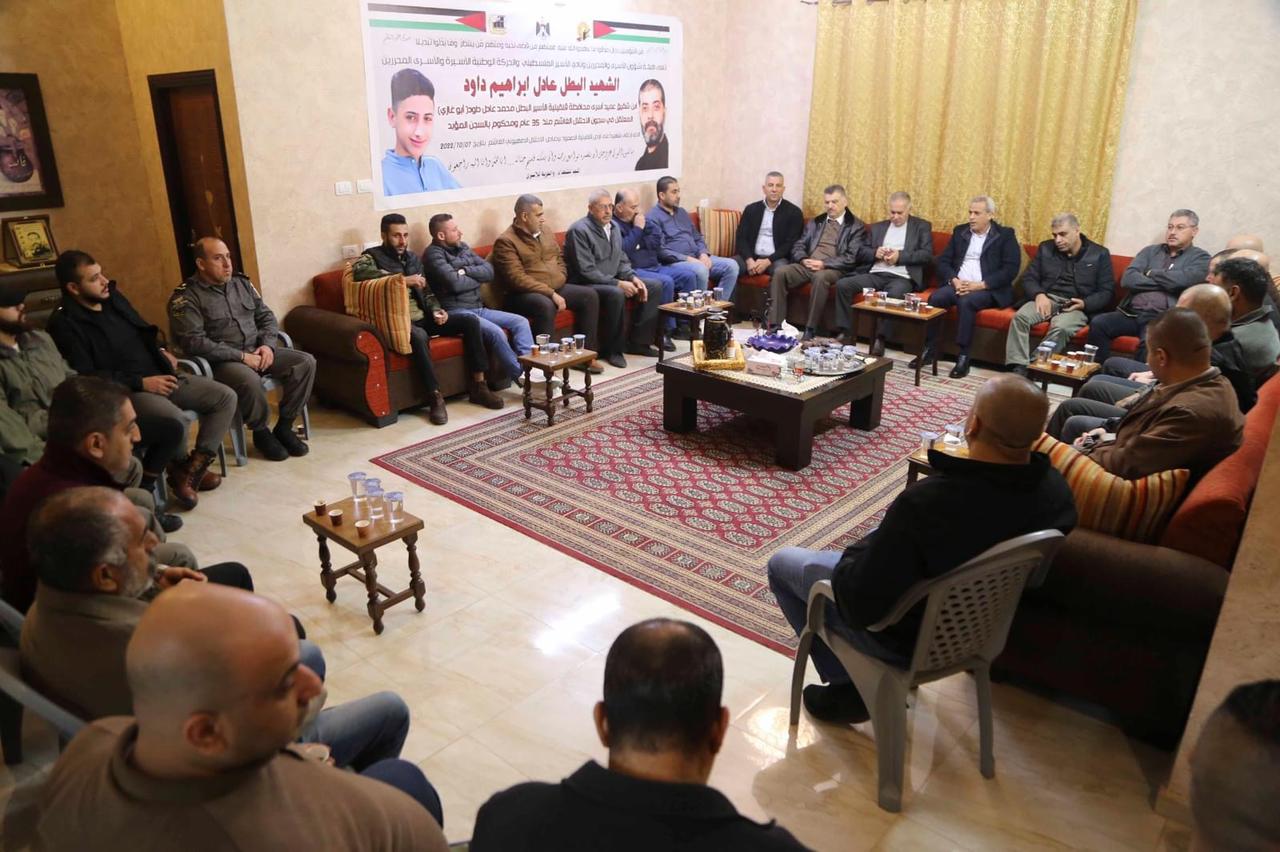وفد من نادي الاسير وهيئة الاسرى والاسرى المحررين خلال تكريم عائلة الاسيرين محمد ومحمود القدومي من بلدة جيوس ، واللذين دخلا عامهم الواحد والعشرون في سجون الاحتلال .