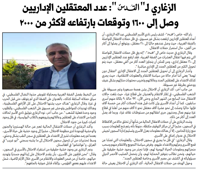 الزغاري لـ " القدس " : عدد المعتقلين الإداريين وصل إلى ١٦٠٠ وتوقعات بارتفاعه لأكثر من ۲۰۰۰