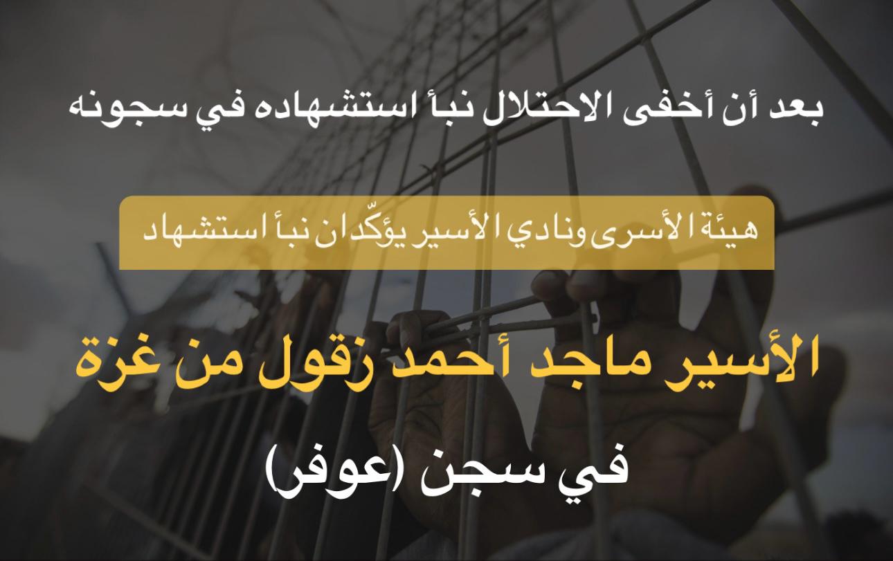 هيئة الأسرى ونادي الأسير يؤكّدان نبأ استشهاد الأسير ماجد أحمد زقول من غزة في سجن (عوفر)