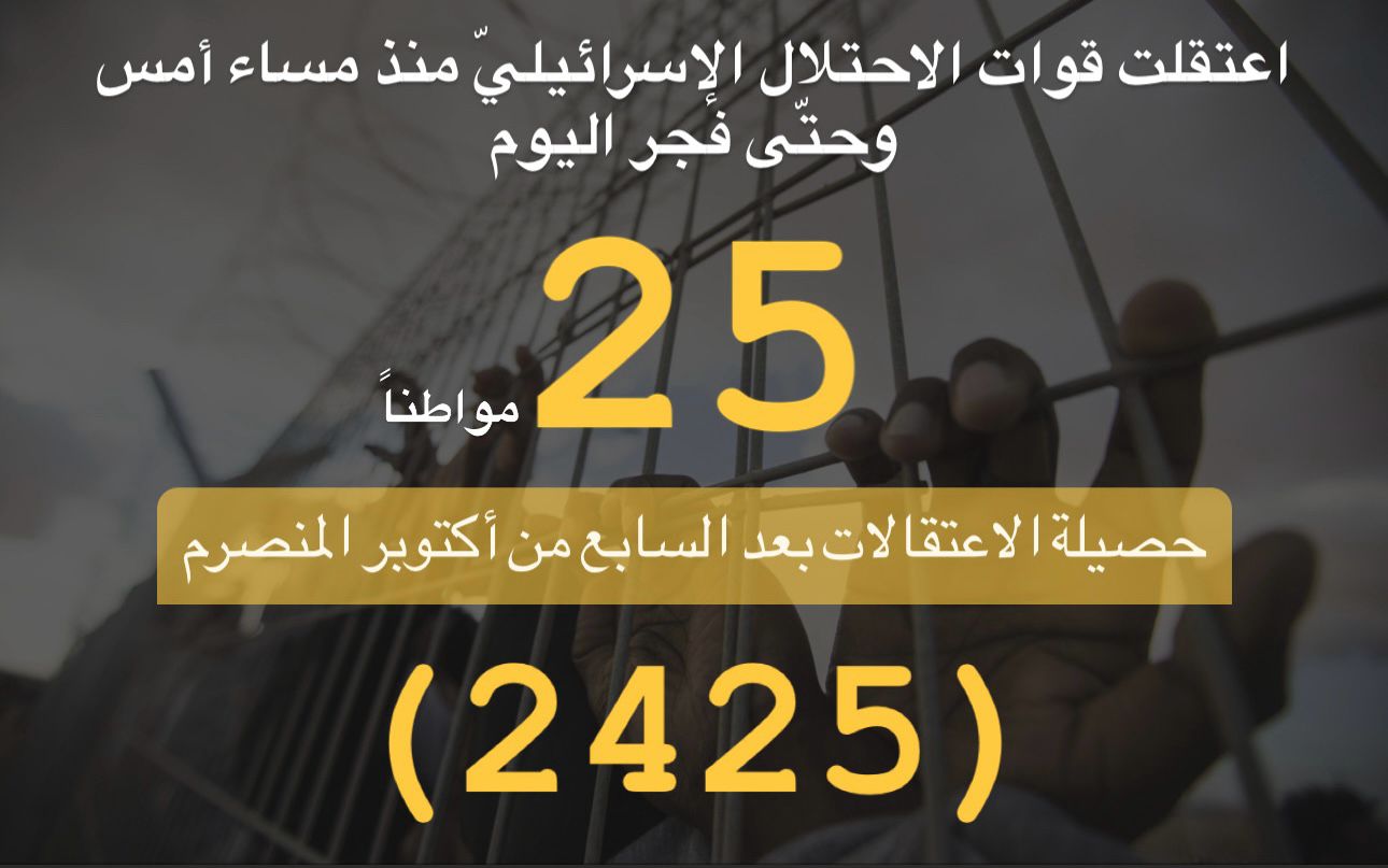 وبذلك ترتفع حصيلة الاعتقالات بعد السابع من أكتوبر المنصرم، إلى (2425)، وهذه الحصيلة تشمل من جرى اعتقالهم من المنازل، وعبر الحواجز العسكرية، ومن اضطروا لتسليم أنفسهم تحت الضغط، ومن احتجزوا كرهائن.