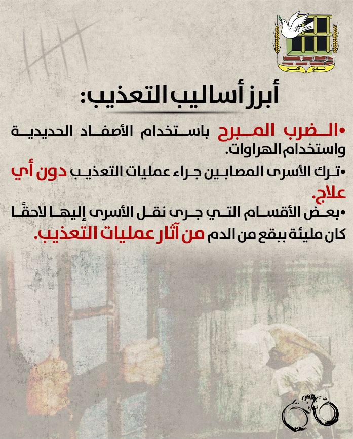 •ترك الأسرى المصابين جراء عمليات التعذيب دون أي علاج وذلك في إطار الجرائم الطبية المستمرة بحقهم.