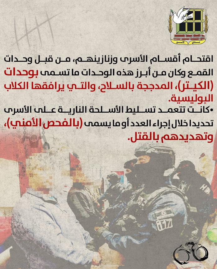 •اقتحام أقسام الأسرى وزنازينهم، من قبل وحدات القمع وكان من أبرز هذه الوحدات ما تسمى بوحدات (الكيتر)، المدججة بالسلاح، والتي يرافقها الكلاب البوليسية.
