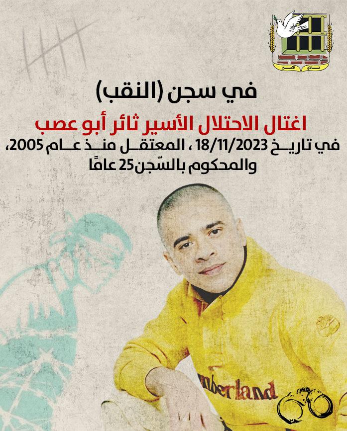 •في سجن (النقب) اغتال الاحتلال الأسير ثائر أبو عصب في تاريخ 18/11/2023، المعتقل منذ عام 2005، والمحكوم بالسّجن 25 عامًا.