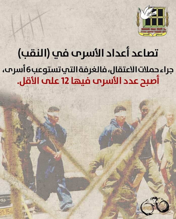 •تصاعد أعداد الأسرى في (النقب) جراء حملات الاعتقال، فالغرفة التي تستوعب 6 أسرى، أصبح عدد الأسرى فيها 12 على الأقل.