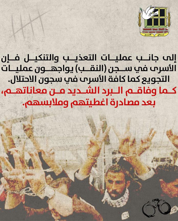 •إلى جانب عمليات التعذيب والتنكيل فإن الأسرى في سجن (النقب) يواجهون عمليات التجويع كما كافة الأسرى في سجون الاحتلال.