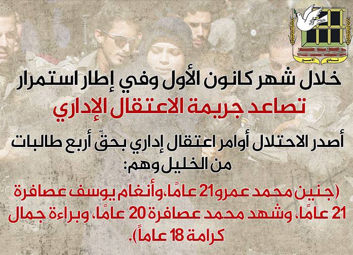 🖇️خلال شهر كانون الأول وفي إطار استمرار تصاعد جريمة الاعتقال الإداري أصدر الاحتلال أوامر اعتقال إداري بحقّ أربع طالبات من الخليل وهن: