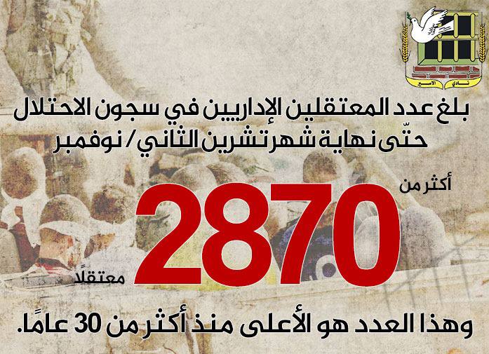🖇️بلغ عدد المعتقلين الإداريين في سجون الاحتلال حتّى نهاية شهر تشرين الثاني/ نوفمبر أكثر من 2870 معتقلًا، وهذا العدد هو الأعلى منذ أكثر من 30 عامًا.