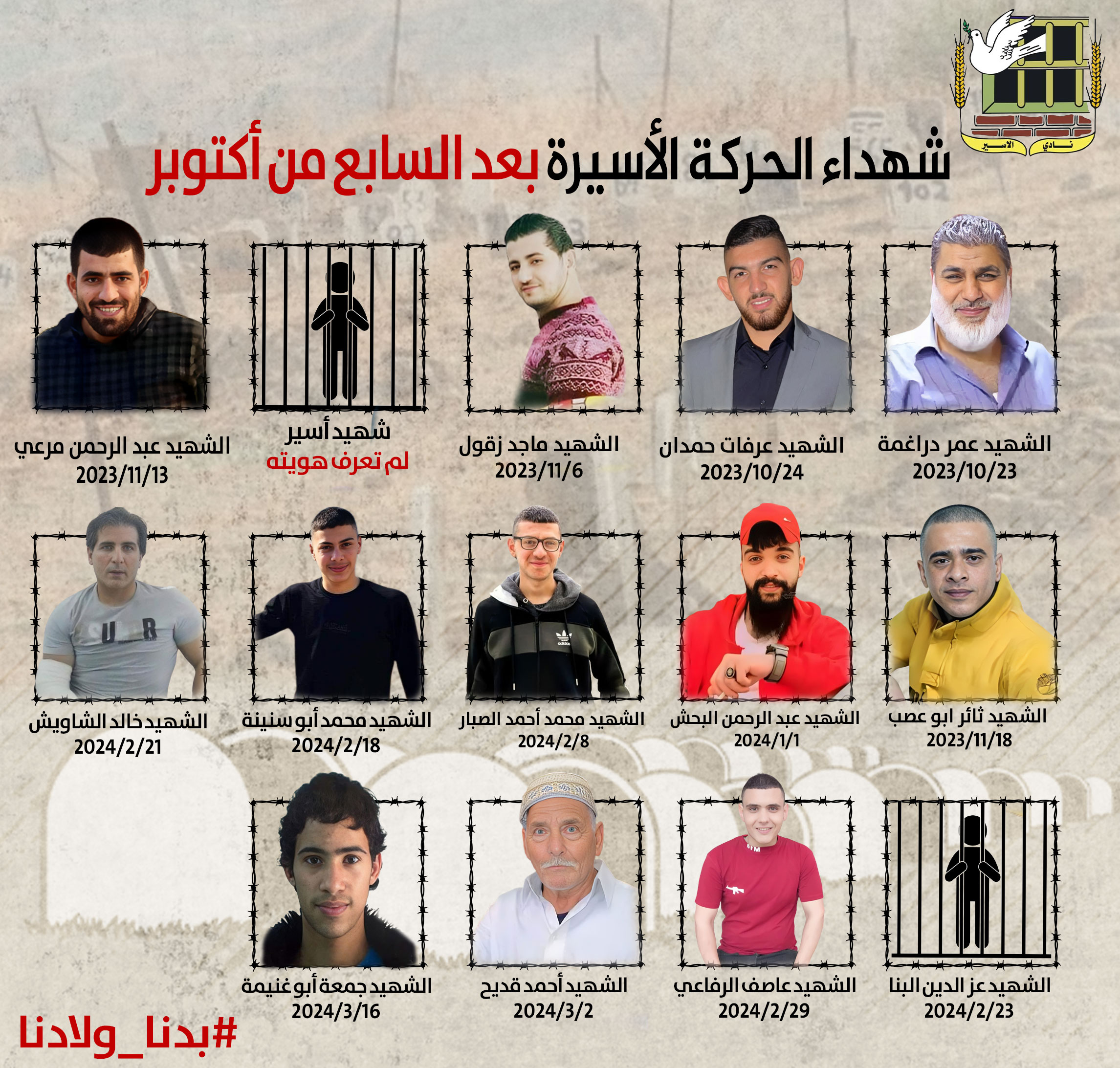 📌 نادي الأسير: مع ارتقاء الأسير جمعة أبو غنيمة يوم أمس يرتفع عدد شهداء الحركة الأسيرة داخل سجون الاحتلال بعد السابع من أكتوبر جرّاء التعذيب، والتنكيل، والتجويع، بالإضافة للجرائم الطبية، إلى 13 شهيدًا وهم: