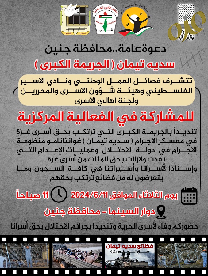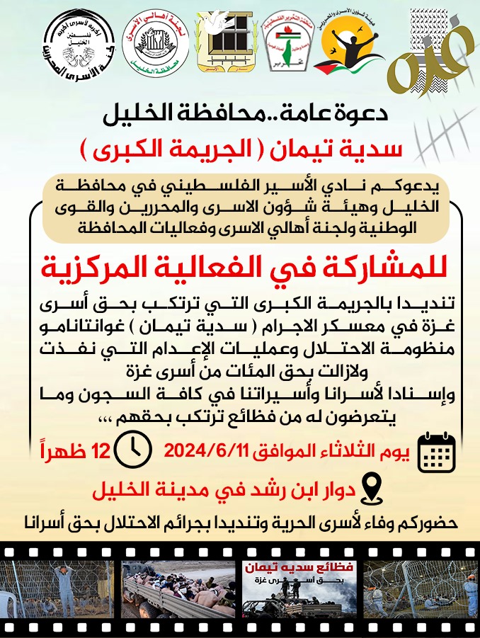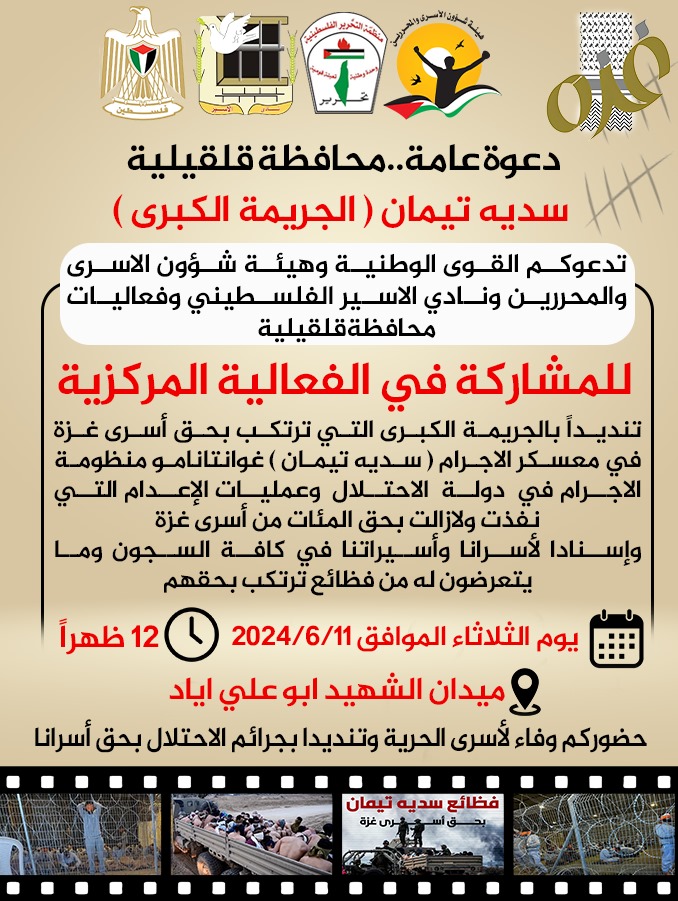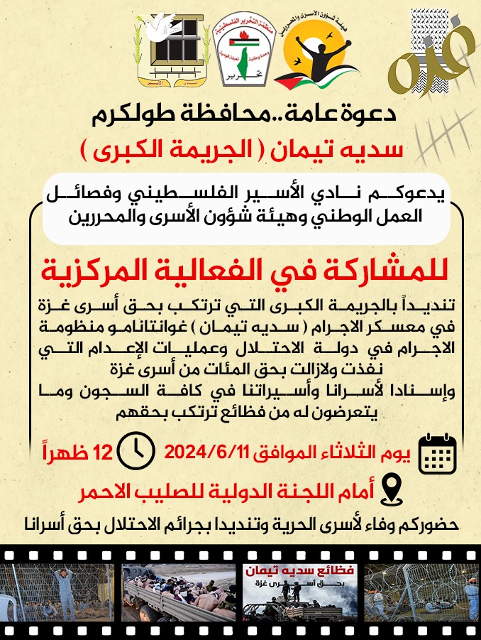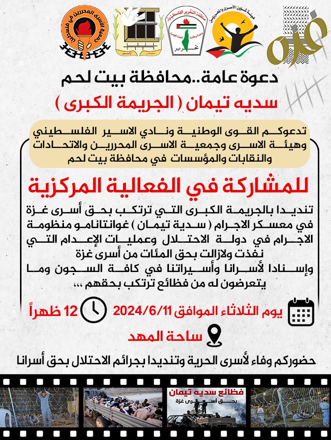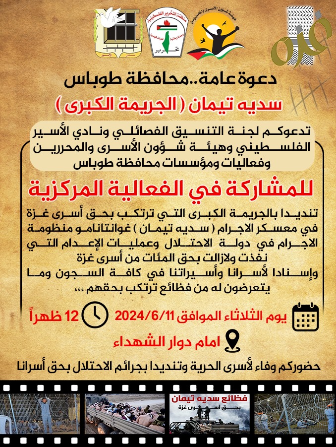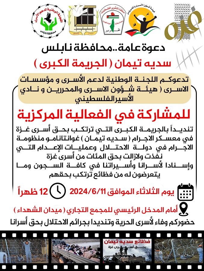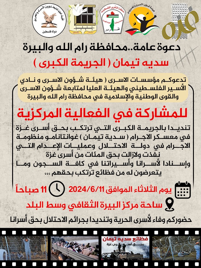 وفي إطار جملة المعطيات المرعبة والمتصاعدة حول عمليات التّعذيب وظروف احتجاز الأسرى القاسية خاصة في المعسكرات التابعة لجيش الاحتلال، ومع مرور الوقت الذي ساهم في تفاقم المعاناة، فإننا ندعوكم إلى المشاركة الفعالة يوم الثلاثاء الموافق 11 حزيران في وسط مراكز مدن الضّفة، تنديدًا بالمجازر المستمرة بحقّ شعبنا في غزة في إطار حرب الإبادة التي تتم بدعم من القوى دولية، وبعمليات التّعذيب والإجراءات الانتقامية التي تمارس بحقّ أسرانا ومنهم معتقلي غزة في المعسكرات