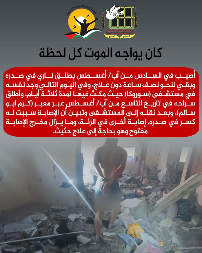 أصيب في السادس من آب/ أغسطس بطلق ناري في صدره وبقي لنحو نصف ساعة دون علاج، وفي اليوم التالي وجد نفسه في مستشفى (سوروكا) حيث مكث فيها لمدة ثلاثة أيام، وأطلق سراحه في تاريخ التاسع من آب/ أغسطس عبر معبر (كرم ابو سالم)، وبعد نقله إلى المستشفى تبين أن الإصابة سببت له كسر في صدره، بالإضافة إلى إصابة أخرى في الرئة، وما يزال مخرج الإصابة مفتوح وهو بحاجة إلى علاج حثيث.