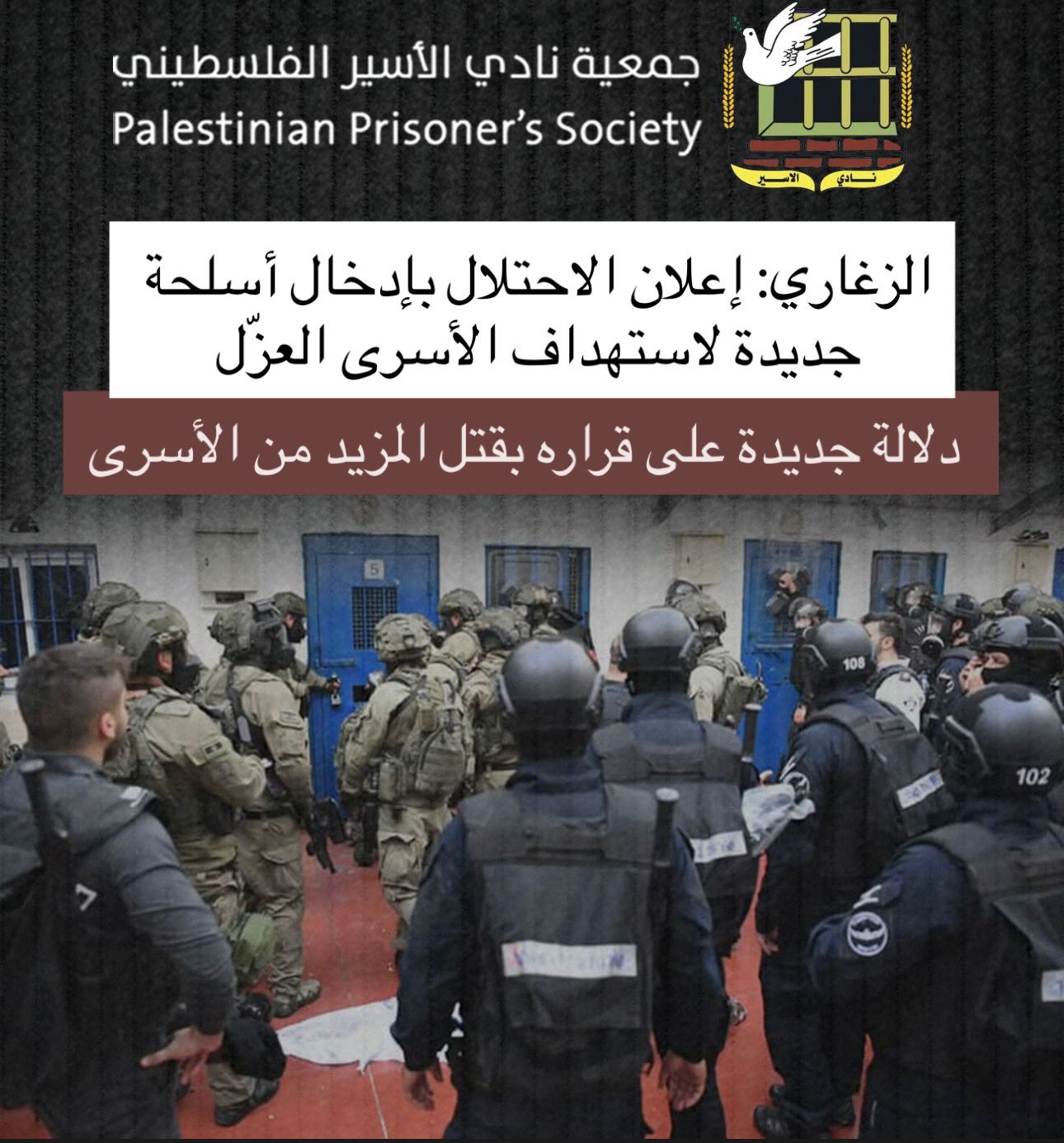 ⭕ Palestinian Prisoner’s Society: New Weapons in Occupation's Prisons Signal Intent to Kill Palestinian Detainees