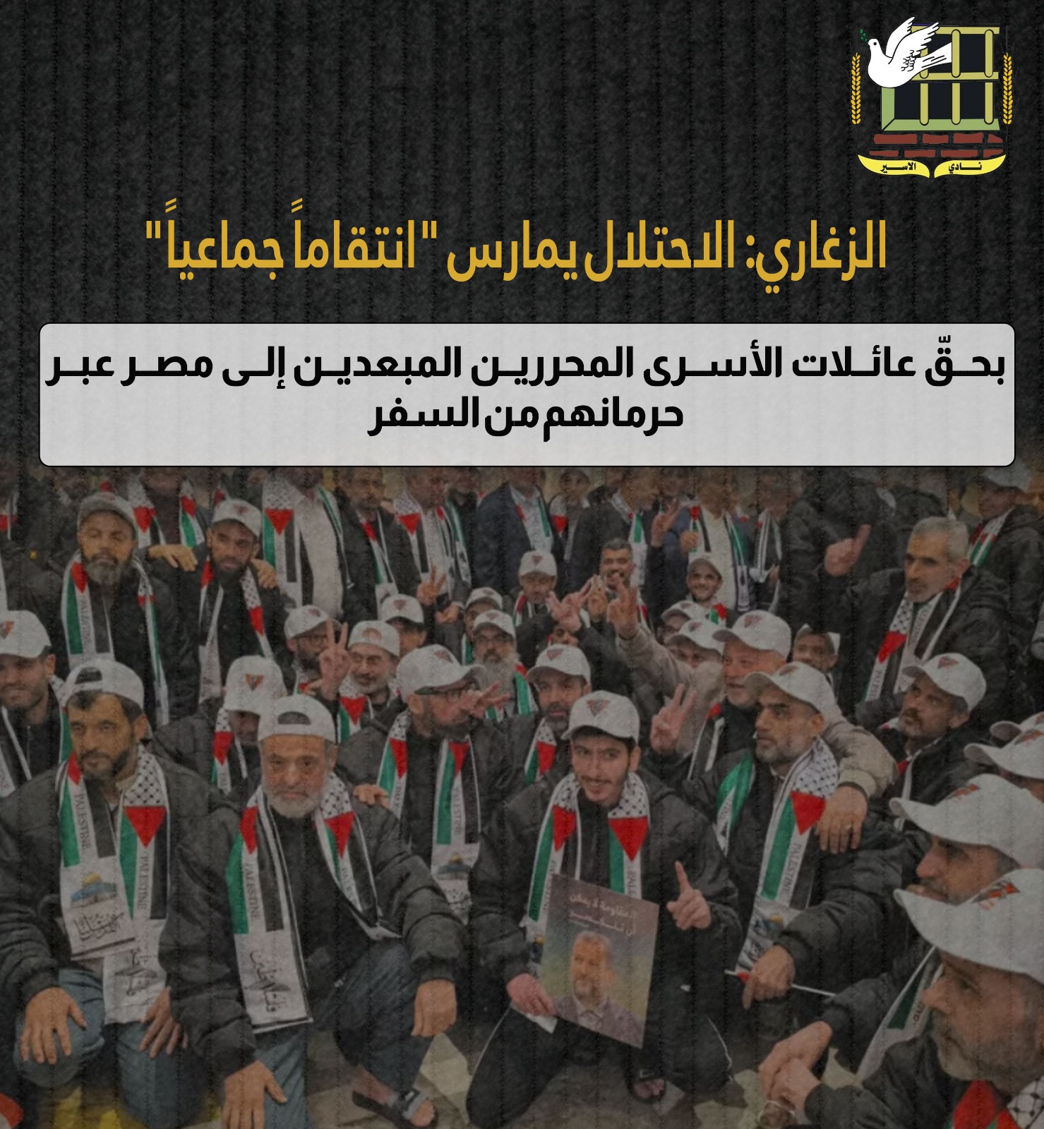 🔴 الزغاري: الاحتلال يمارس انتقاماً جماعياً بحقّ عائلات الأسرى المحررين المبعدين إلى مصر عبر حرمانهم من السفر