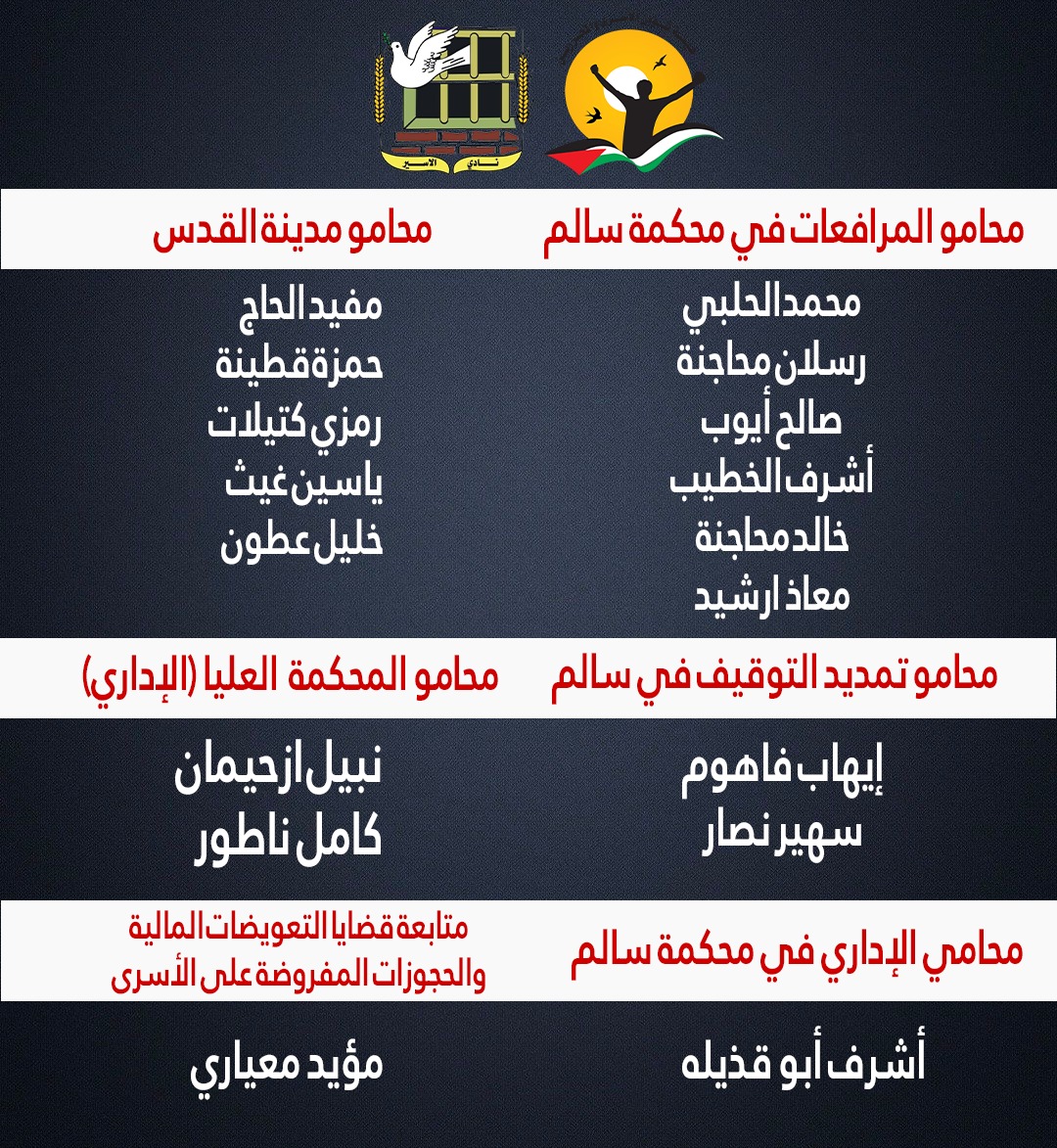 تعميم بأسماء المحامين المكلّفين بمتابعة قضايا الأسرى في محاكم الاحتلال في مراحل: التمديد، ومتابعة سير القضايا في المحاكم (المرافعات)، وكذلك متابعة المعتقلين الإداريين خلال جلسات التثبيت، والاستئناف، والالتماسات المقدّمة إلى المحكمة العليا.👇