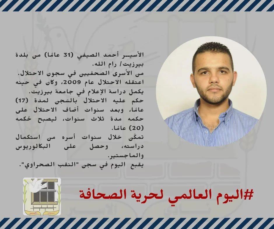 الأسير أحمد الصيفي من بلدة بيرزيت - رام الله، اعتقلته قوات الاحتلال عام 2009، وكان في حينه يكمل دراسة الاعلام في جامعة بيرزيت، وحكم عليه الاحتلال بالسجن 17 عاماً، تمكن خلال سنوات أسره من استكمال دراسته، وحصل على البكالوريوس والماجستير.