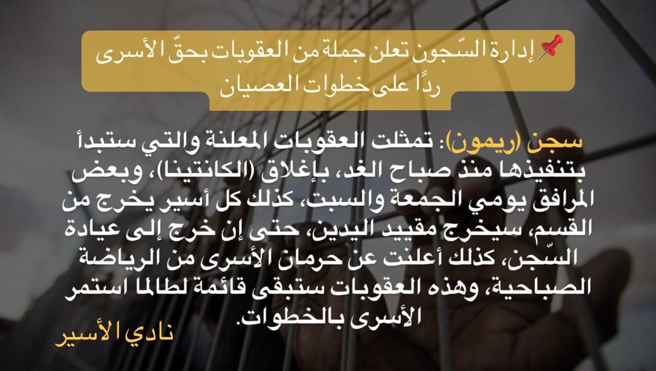 ففي سجن (ريمون)، تمثلت العقوبات المعلنة والتي ستبدأ بتنفيذها منذ صباح الغد، بإغلاق (الكانتينا)، وبعض المرافق يومي الجمعة والسبت، كذلك كل أسير يخرج من القسم، سيخرج مقييد اليدين، حتى إن خرج إلى عيادة السّجن، كذلك أعلنت عن حرمان الأسرى من الرياضة الصباحية، وهذه العقوبات ستبقى قائمة لطالما استمر الأسرى بالخطوات.