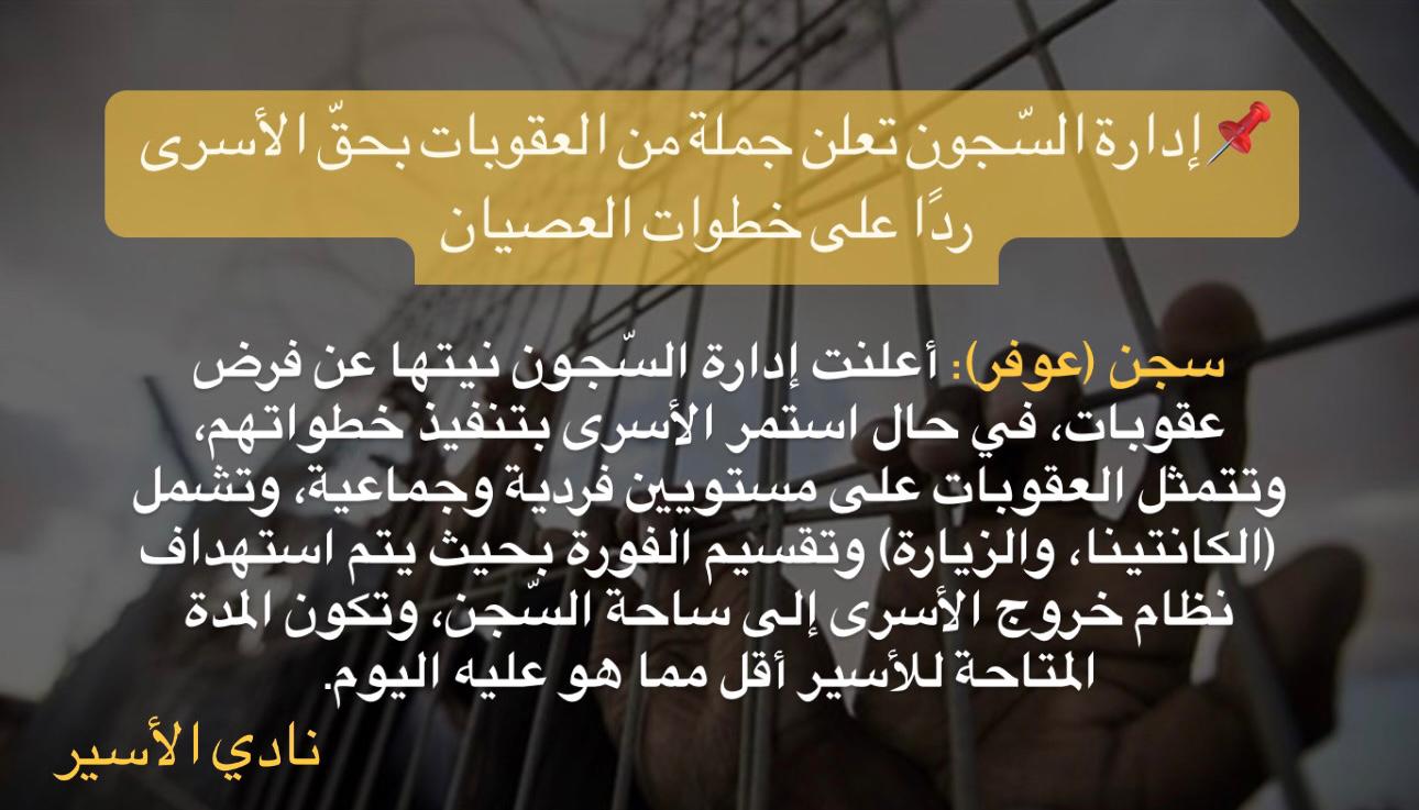 وفي سجن (عوفر)، أعلنت إدارة السّجون نيتها عن فرض عقوبات، في حال استمر الأسرى بتنفيذ خطواتهم، وتتمثل العقوبات على مستويين فردية وجماعية، وتشمل (الكانتينا، والزيارة) وتقسيم الفورة بحيث يتم استهداف نظام خروج الأسرى إلى ساحة السّجن، وتكون المدة المتاحة للأسير أقل مما هو عليه اليوم.