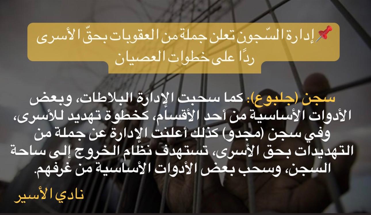 كما سحبت الإدارة البلاطات، وبعض الأدوات الأساسية من أحد الأقسام في سجن (جلبوع)، كخطوة تهديد للأسرى، وفي سجن (مجدو) كذلك أعلنت الإدارة عن جملة من التهديدات بحق الأسرى، تستهدف نظام الخروج إلى ساحة السجن، وسحب بعض الأدوات الأساسية من غرفهم.
