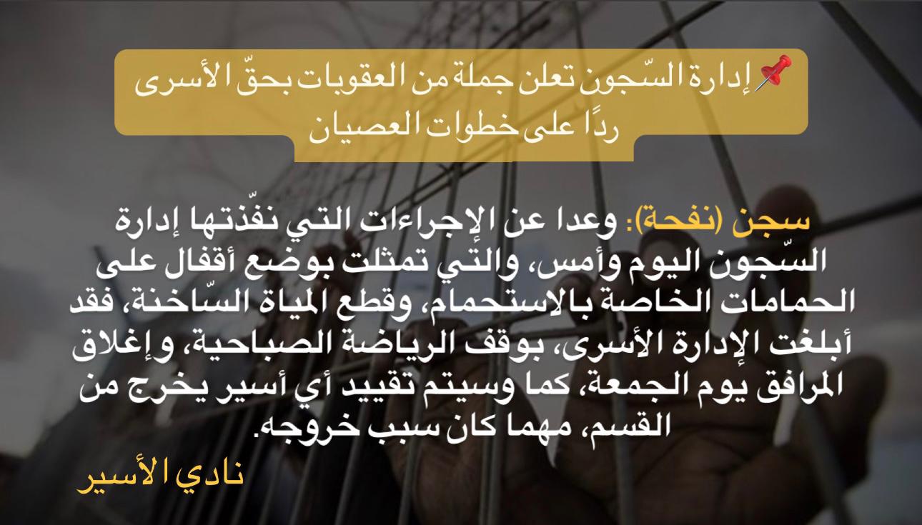 وكان الأسرى يوم أمس في سجن (نفحة) قد شرعوا بتنفيذ خطوات عصيان، وأقدمت إدارة السّجون على قطع المياه السّاخنة عن الأسرى في سجن (نفحة)، كما أقدم أحد السّجانين يوم أمس خلال ما يسمى (بالفحص الأمني) باستفزاز الأسرى، والتباهي بإجراءات (بن غفير)، الأمر الذي فرض حالة من التوتر في السّجن، ورد الأسرى بالتكبير في عدة أقسام.
