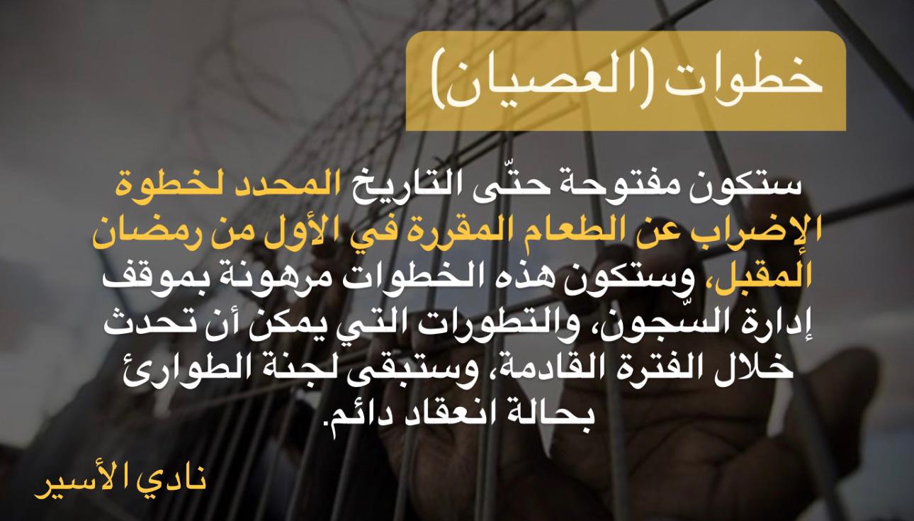 وأكدت الهيئة ونادي الأسير مجددًا أنّ خطوات (العصيان) ستكون مفتوحة حتّى التاريخ المحدد لخطوة الإضراب عن الطعام المقررة في الأول من رمضان المقبل، وستكون هذه الخطوات مرهونة بموقف إدارة السّجون، والتطورات التي يمكن أن تحدث خلال الفترة القادمة، وستبقى لجنة الطوارئ بحالة انعقاد دائم.