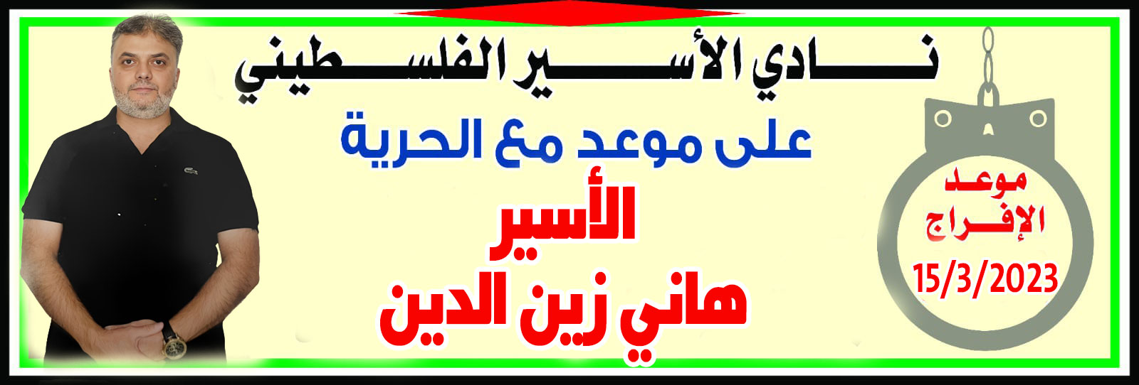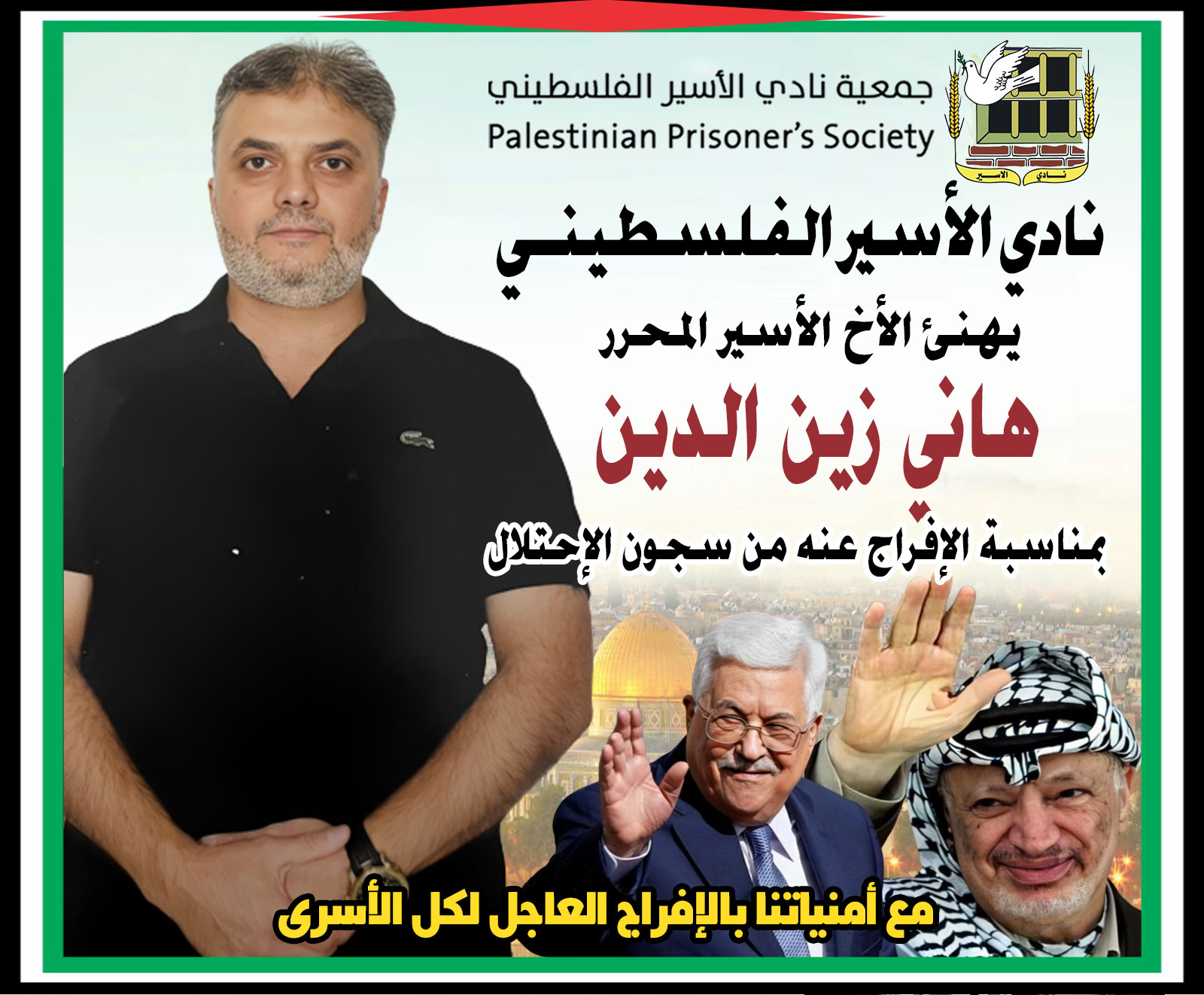 نادي الأسير: على موعد مع الحرية غداً الأربعاء، الأسير هاني زين الدين (52 عاماً) من بلدة مجدل بني فاضل/نابلس، بعد أن أمضى في سجون الاحتلال 17 عاماً.