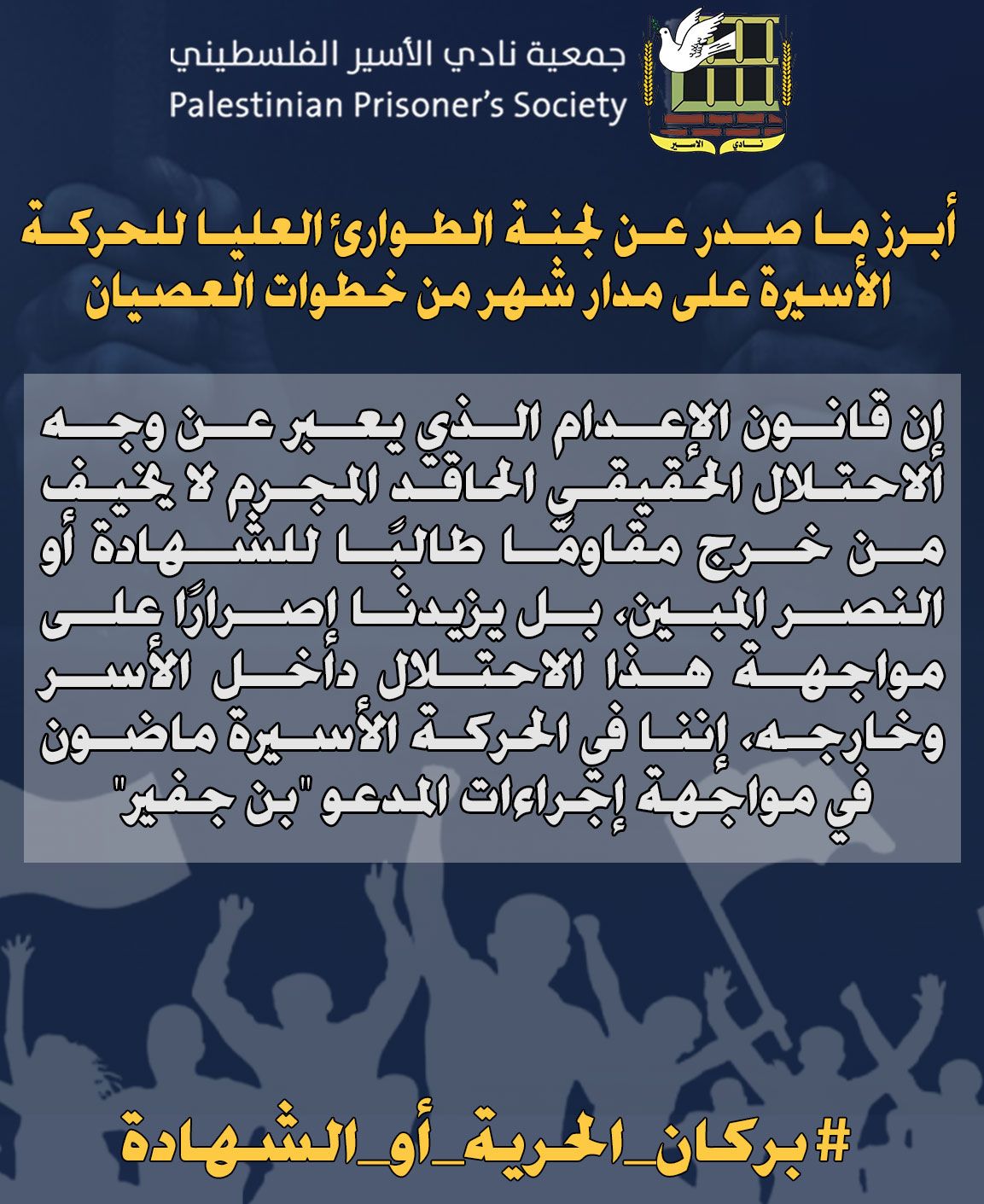 (إن قانون الإعدام الذي يعبر عن وجه الاحتلال الحقيقي الحاقد المجرم لا يخيف من خرج مقاومًا طالبًا للشهادة أو النصر المبين، بل يزيدنا إصرارًا على مواجهة هذا الاحتلال داخل الأسر وخارجه، إننا في الحركة الأسيرة ماضون في مواجهة إجراءات المدعو "بن جفير")
