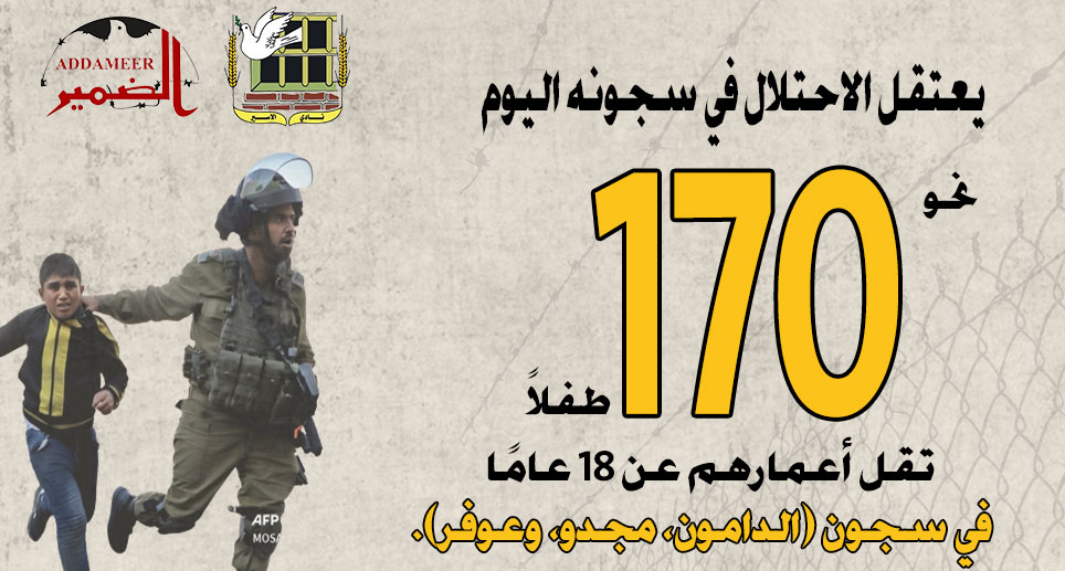 - يعتقل الاحتلال في سجونه اليوم نحو 170 طفلاً تقل أعمارهم عن 18 عامًا، في سجون (الدامون، مجدو، وعوفر).