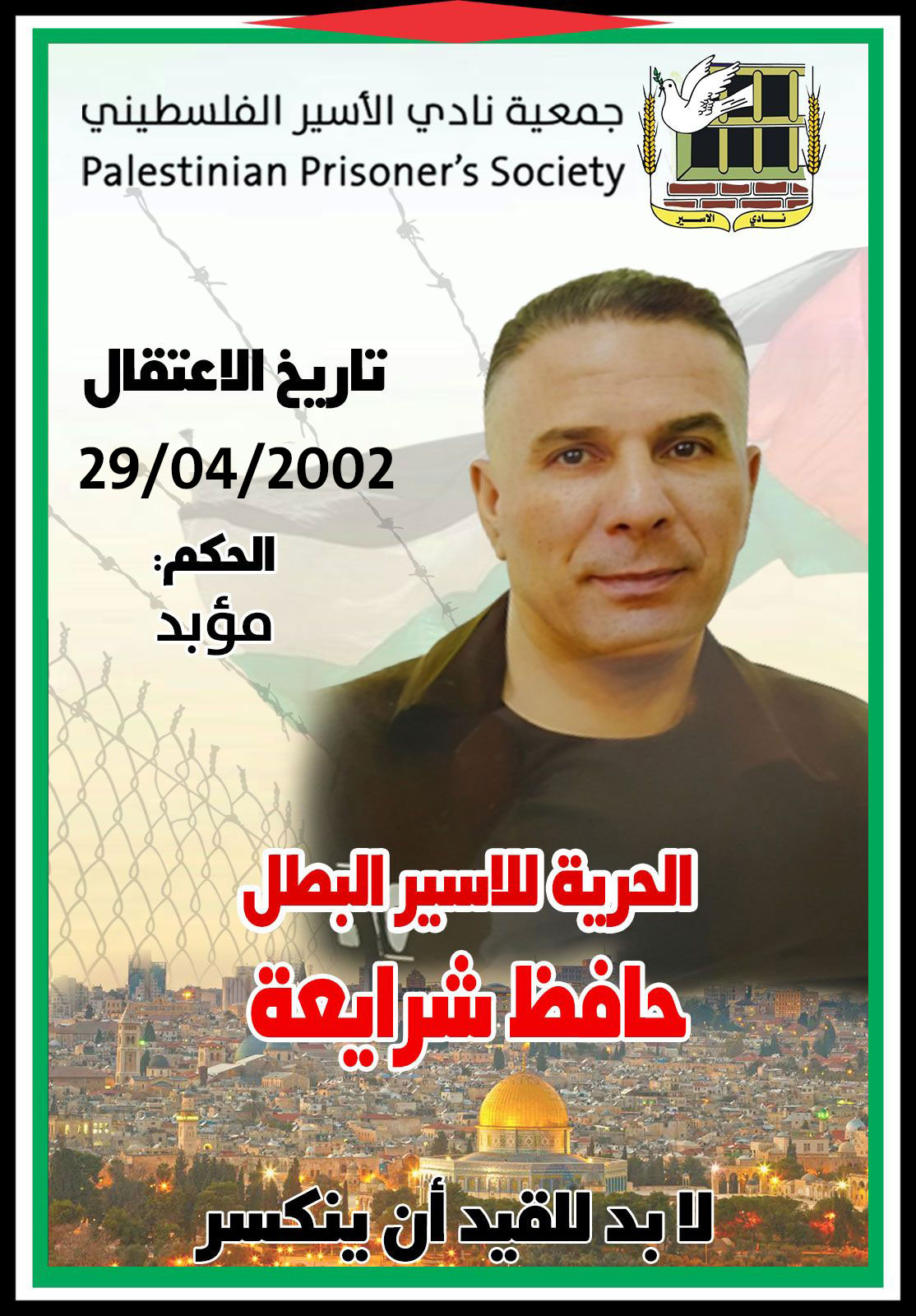 نادي الأسير: دخل الأسير حافظ شرايعة (49 عامًا) من بيت لحم، عامه الـ22 في سجون الاحتلال الإسرائيلي، وذلك منذ اعتقاله عام 2002.