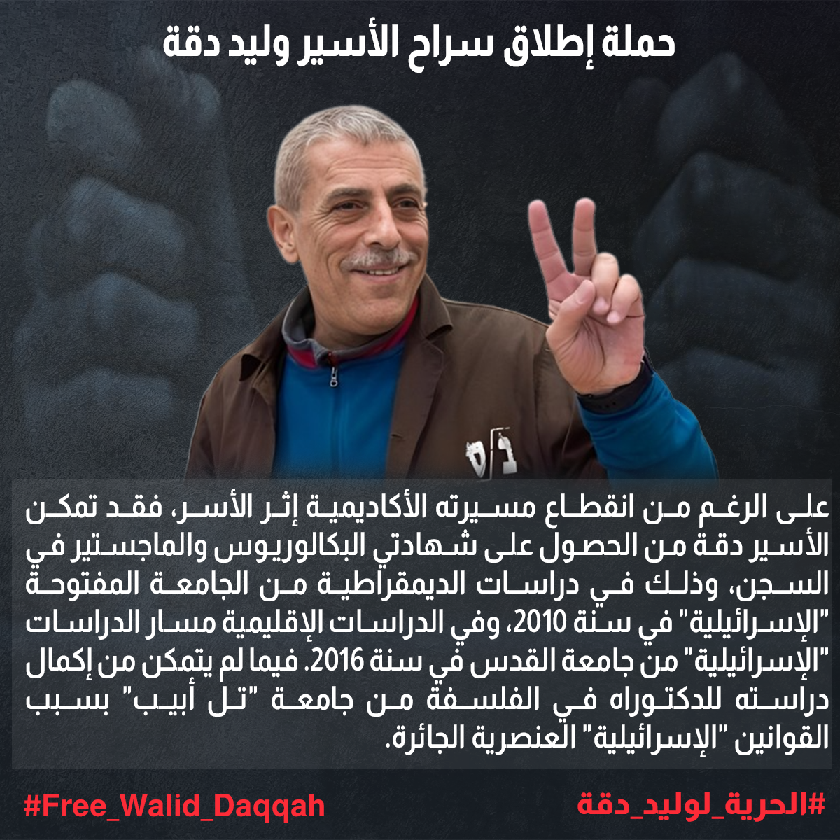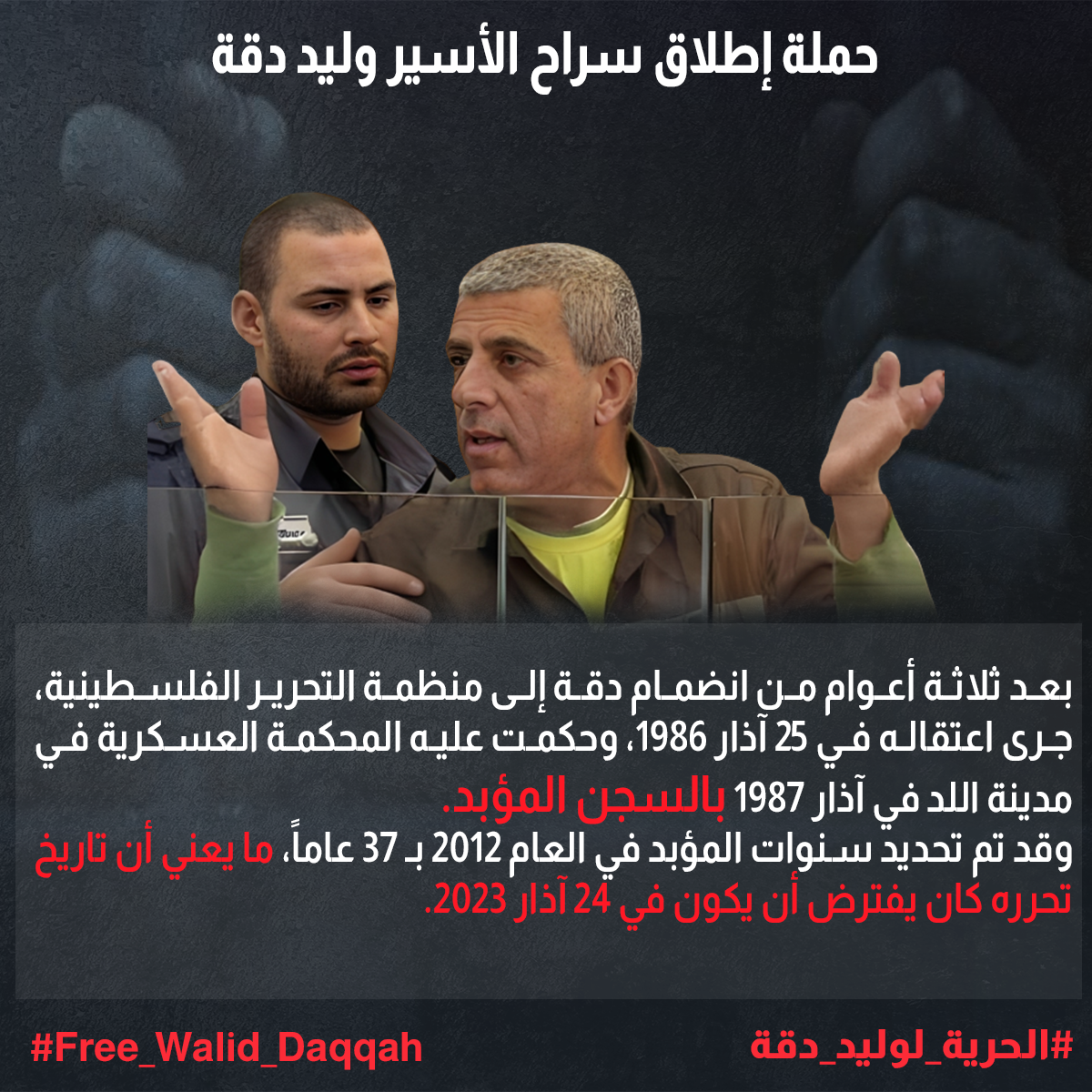 وليد أنهى حكمه الأول وهو 37 عام. أنهاه في 24 آذار الماضي وبدأ في الحكم الثاني ألا وهو العامين الإضافيين الذين أضيفوا لحكمه بسبب محاولته تهريب تليفونات نقالة للأسرى كي يتواصلوا مع أهلهم. يجدر بالذكر أن قضية الهواتف في السجون لا تعتبر قضية "إرهابية" وقد كانت هناك الكثير من عمليات تهريب هواتف إنتهت بعقوبة داخلية بالسجن بدون محاكم وبدون إضافة للحكم. هذين العامين أصبحوا مصيريين جداً لحياة وليد.