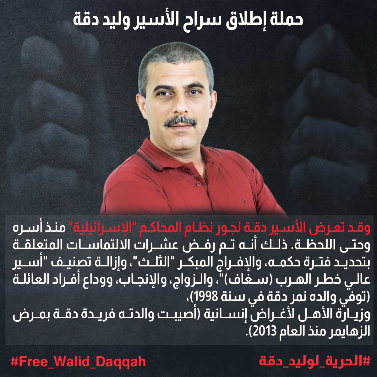 وقد تعرض الأسير دقة لجور نظام المحاكم "الإسرائيلية" منذ أسره وحتى اللحظة. ذلك أنه تم رفض عشرات الالتماسات المتعلقة بتحديد فترة حكمه، والإفراج المبكر "الثلث"، وإزالة تصنيف "أسير عالي خطر الهرب (سغاف)"، والزواج، والإنجاب، ووداع أفراد العائلة (توفي والده نمر دقة في سنة 1998)، وزيارة الأهل لأغراض إنسانية (أصيبت والدته فريدة دقة بمرض الزهايمر منذ العام 2013)، أو الإفراج المبكر للعلاج من المرض بعد أن كُشف عن إصابته بسرطان الدم في سنة 2015.