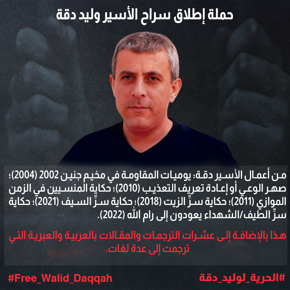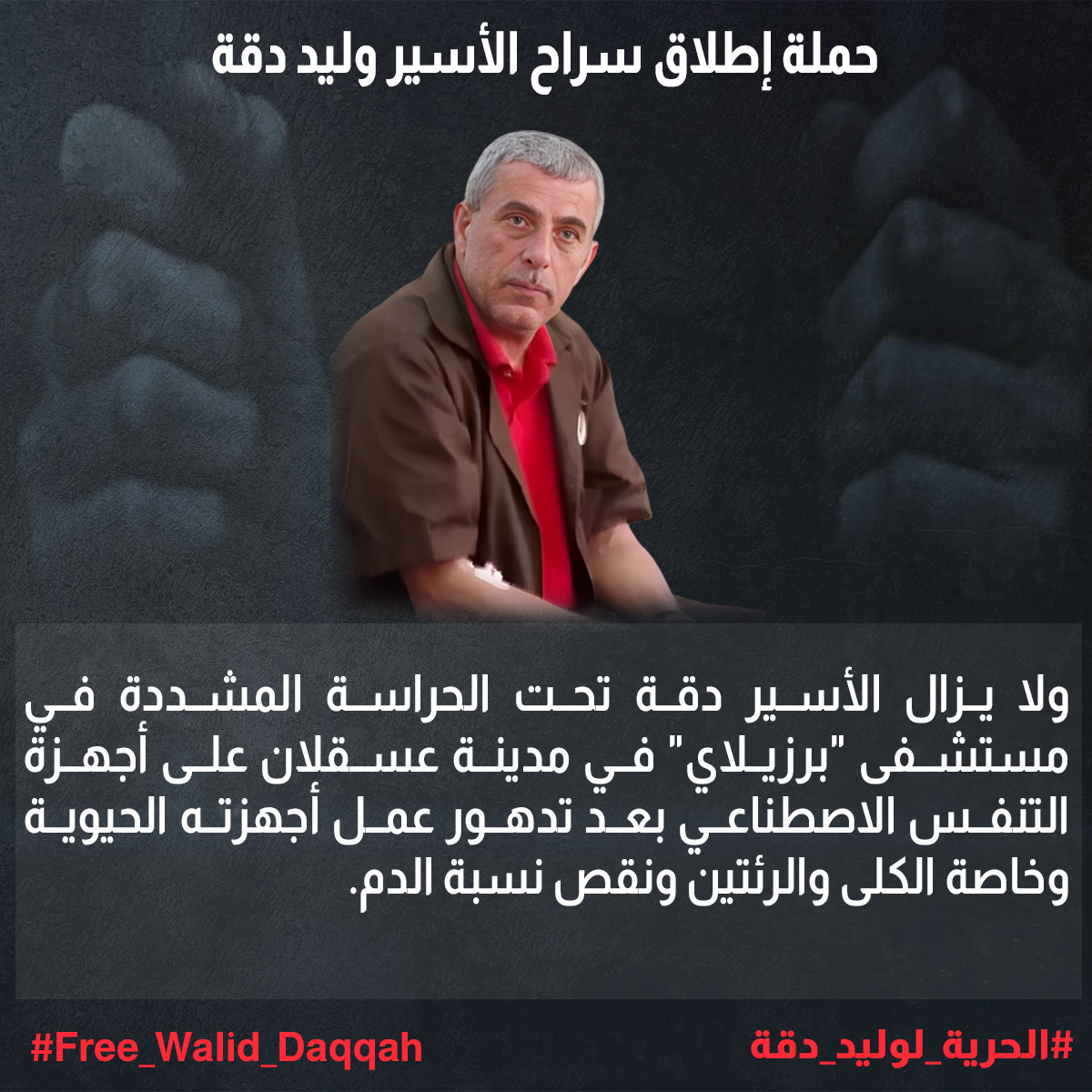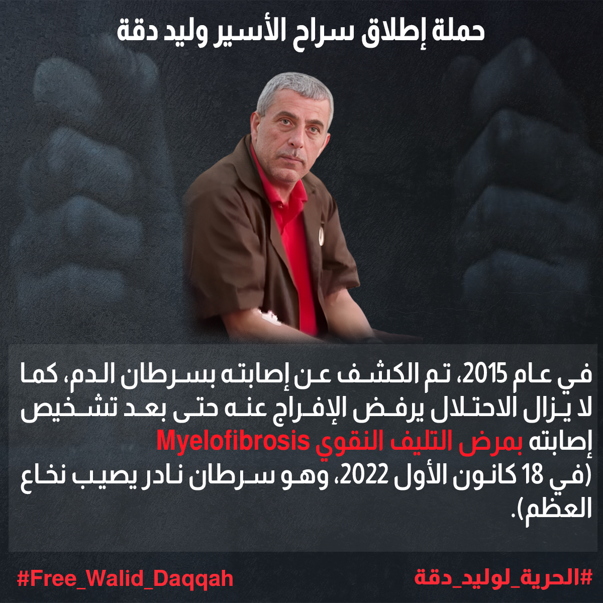 كما لا يزال الاحتلال يرفض الإفراج عنه حتى بعد تشخيص إصابته بمرض التليف النقوي Myelofibrosis (وهو سرطان نادر يصيب نخاع العظم) في 18 كانون الأول 2022.