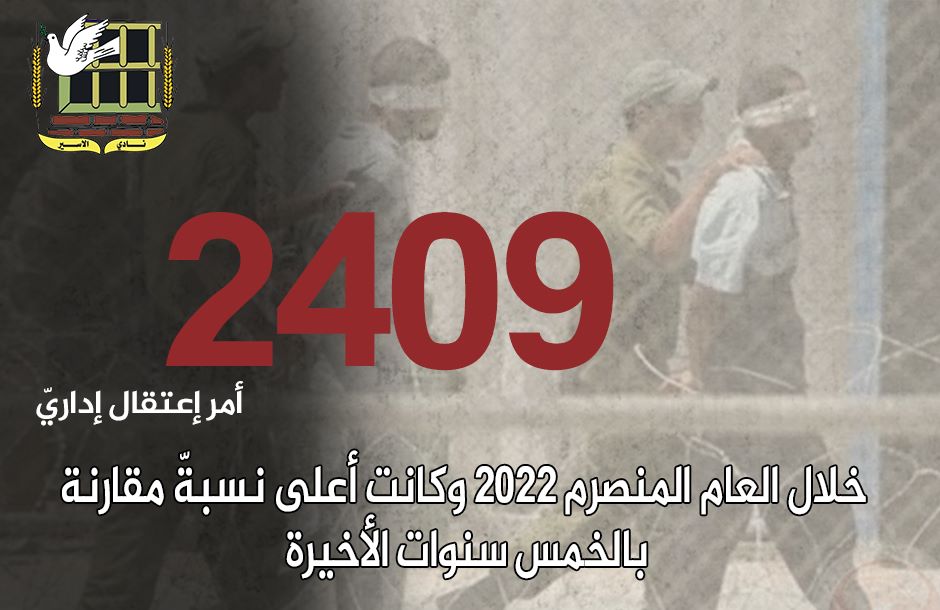 • كانت أعلى نسبة في أوامر الاعتقال الإداريّ مقارنة بالخمس سنوات الأخيرة، خلال العام 2022، وبلغت (2409).