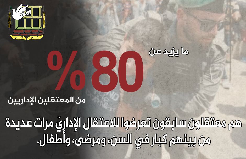 وأشار نادي الأسير إلى أنّ (80) % من المعتقلين الإداريين، هم معتقلون سابقون أمضوا سنوات في سجون الاحتلال ومنها رهنّ الاعتقال الإداري.
