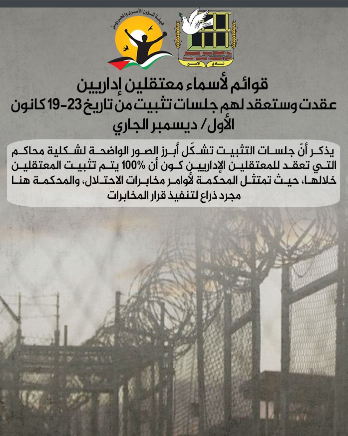 🔴 قوائم لأسماء معتقلين إداريين عقدت وستعقد لهم جلسات تثبيت من تاريخ 19-23 كانون الأول/ ديسمبر الجاري