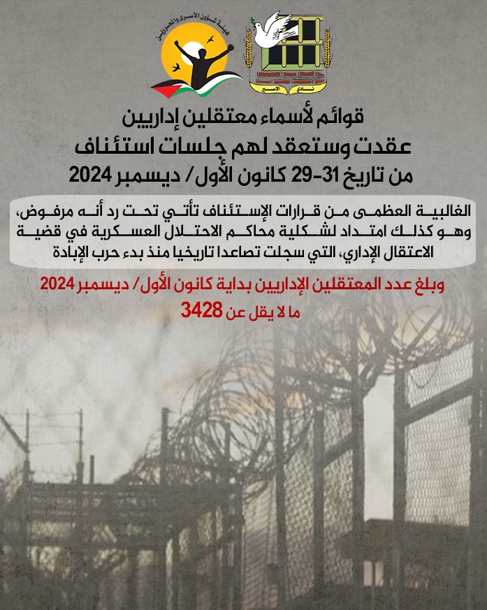 🔴 قوائم لأسماء معتقلين إداريين عقدت وستعقد لهم جلسات استئناف من تاريخ 29-31 كانون الأول/ ديسمبر 2024