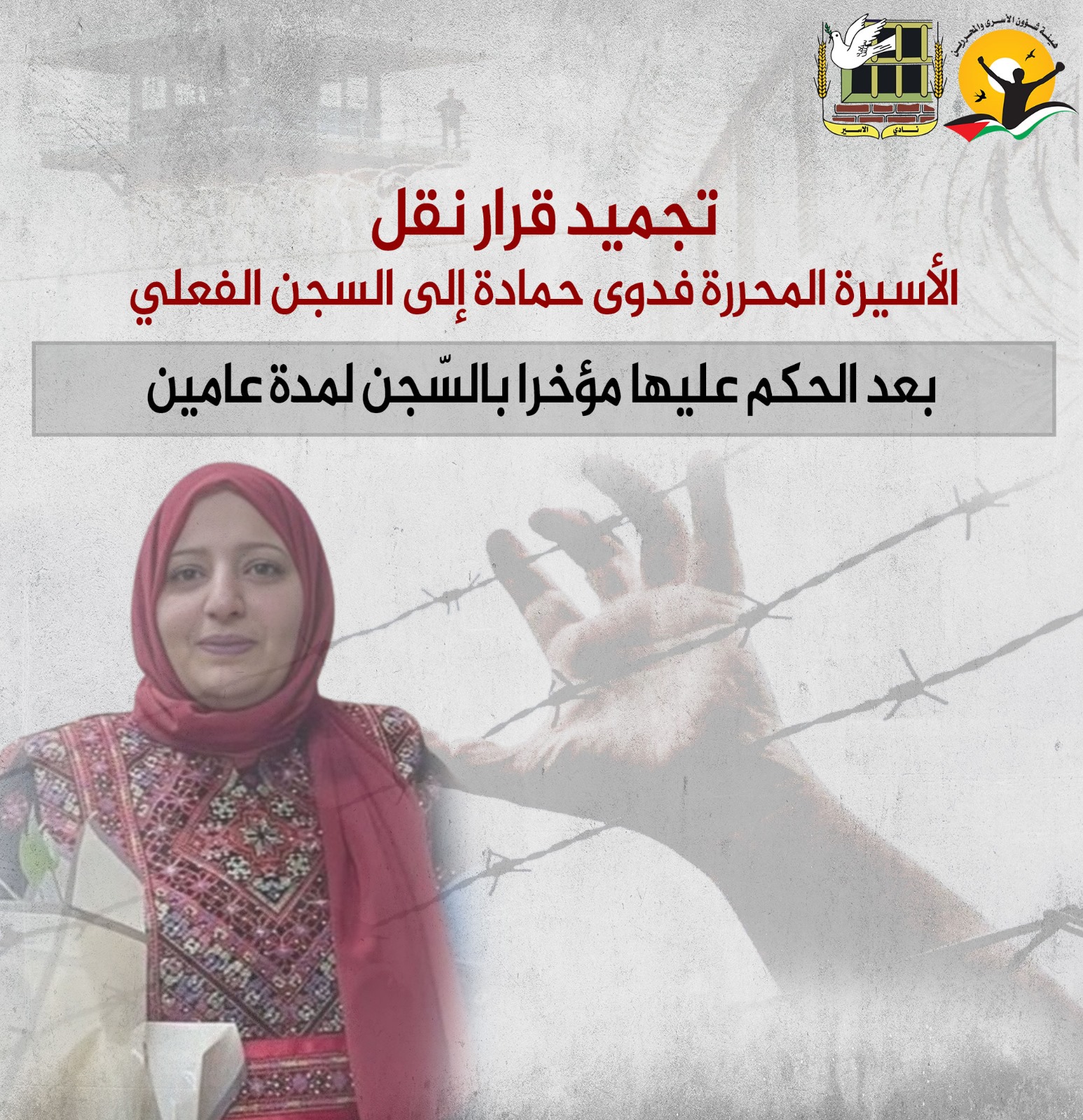 🔴 هيئة الأسرى ونادي الأسير: تجميد قرار نقل الأسيرة المحررة فدوى حمادة إلى السجن الفعلي بعد الحكم عليها مؤخرا بالسّجن لمدة عامين