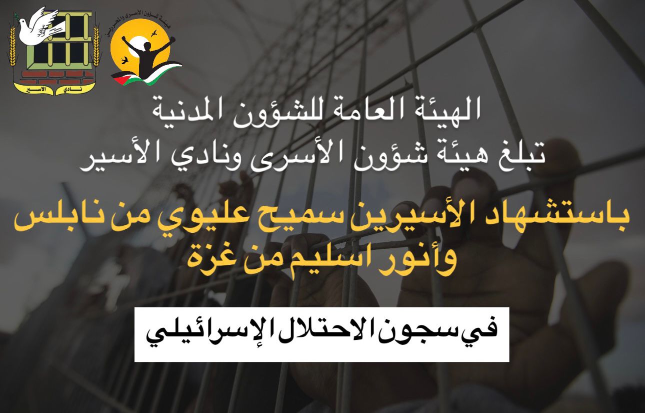 🔴 عاجل:الهيئة العامة للشؤون المدنية تبلغ هيئة شؤون الأسرى ونادي الأسير باستشهاد الأسيرين سميح عليوي من نابلس، وأنور اسليم من غزة في سجون الاحتلال الإسرائيلي"