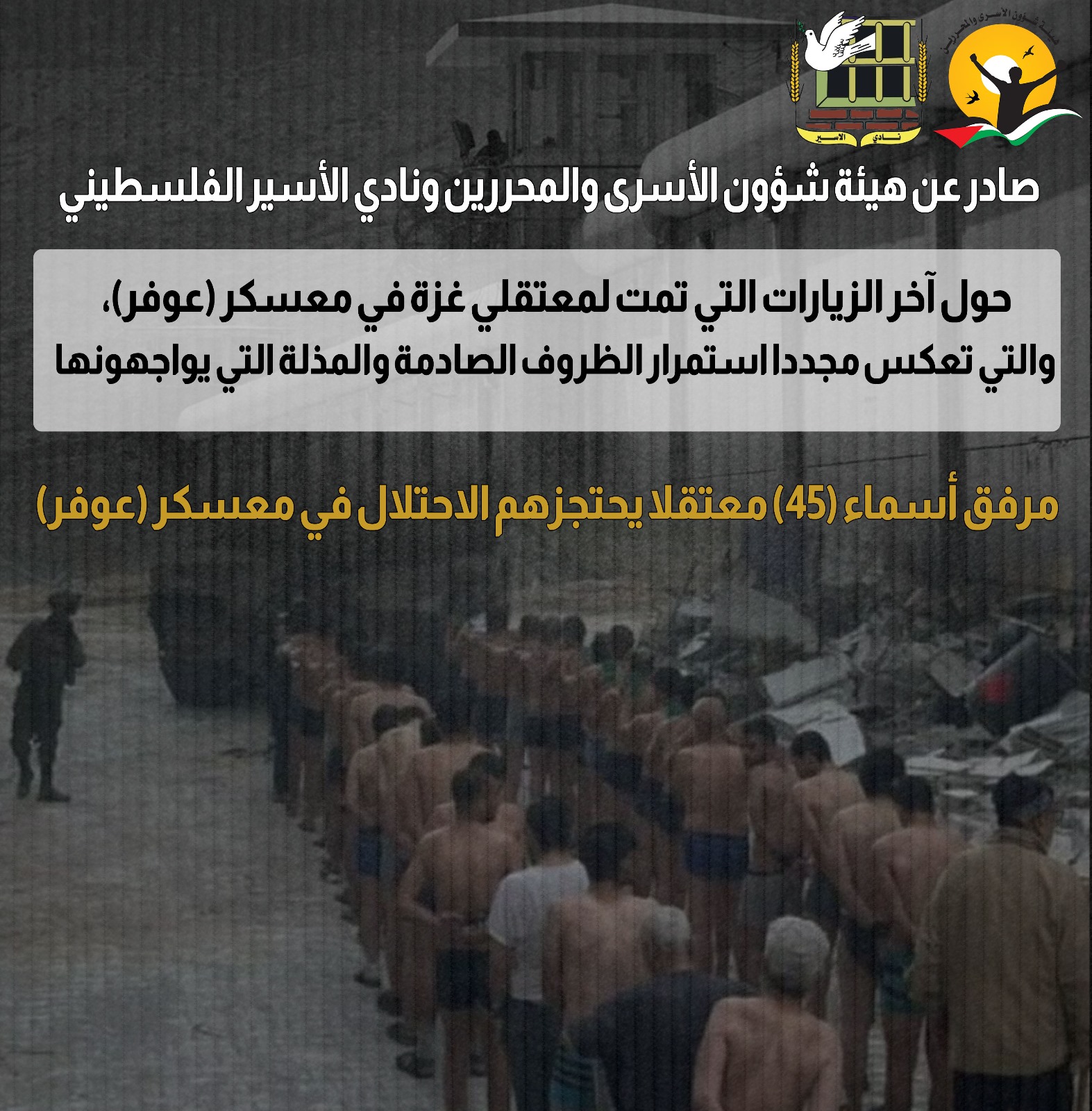 🔴 صادر عن هيئة شؤون الأسرى والمحررين ونادي الأسير الفلسطيني حول آخر الزيارات التي تمت لمعتقلي غزة في معسكر (عوفر)، والتي تعكس مجددا استمرار الظروف الصادمة والمذلّة التي يواجهونها المزيد من التفاصيل