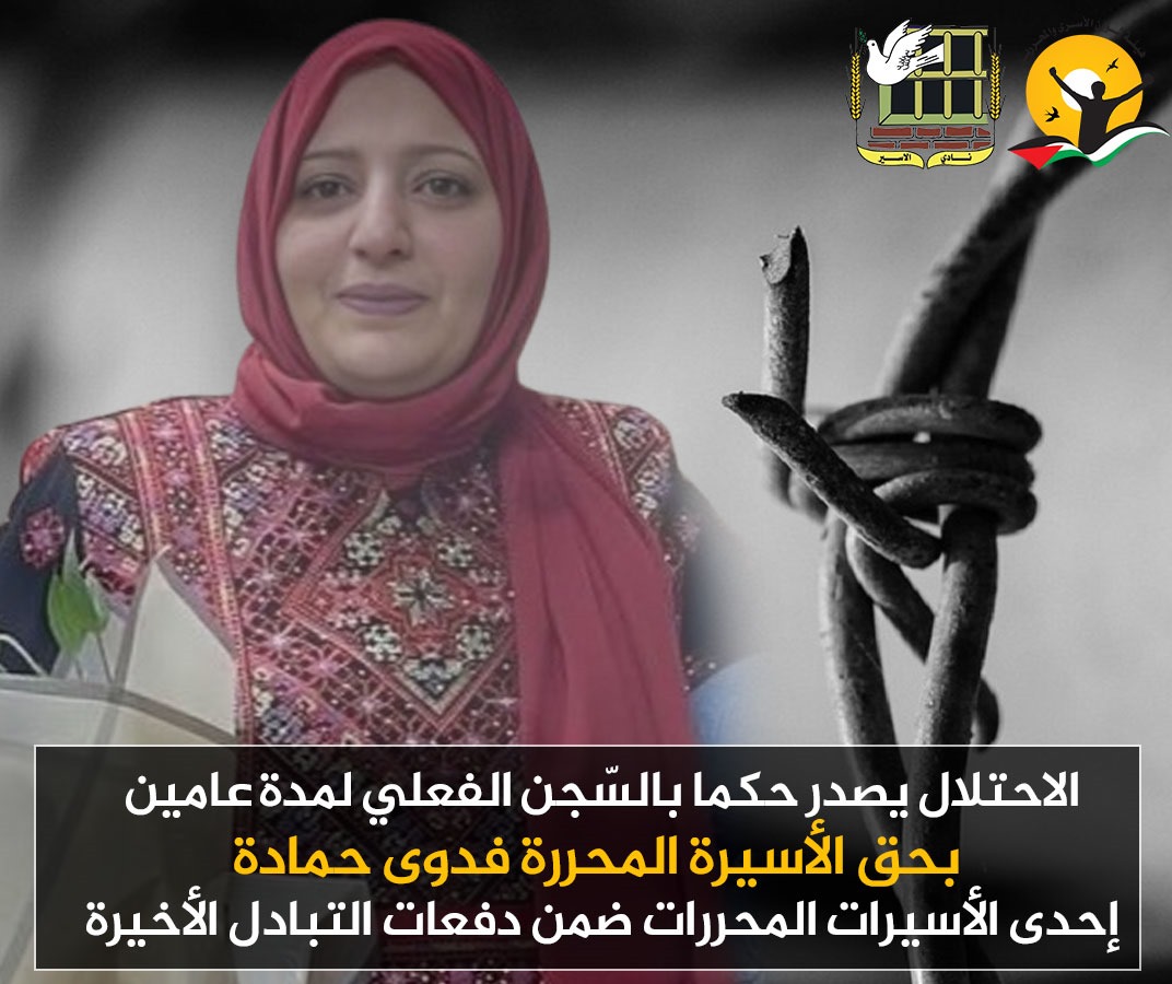 🔴 هيئة الأسرى ونادي الأسير: الاحتلال يصدر حكما بالسّجن الفعلي لمدة عامين بحق الأسيرة المحررة فدوى حمادة إحدى الأسيرات المحررات ضمن دفعات التبادل الأخيرة